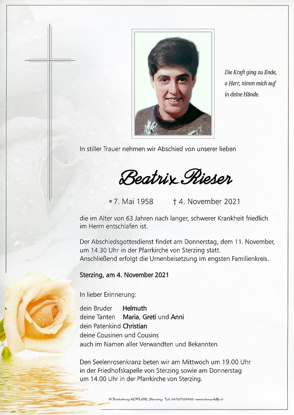 Der Abschiedsgottesdienst findet am Donnerstag, dem 11. November, um 14.30 Uhr in der Pfarrkirche von Sterzing statt. Anschließend erfolgt die Urnenbeisetzung im engsten Familienkreis.