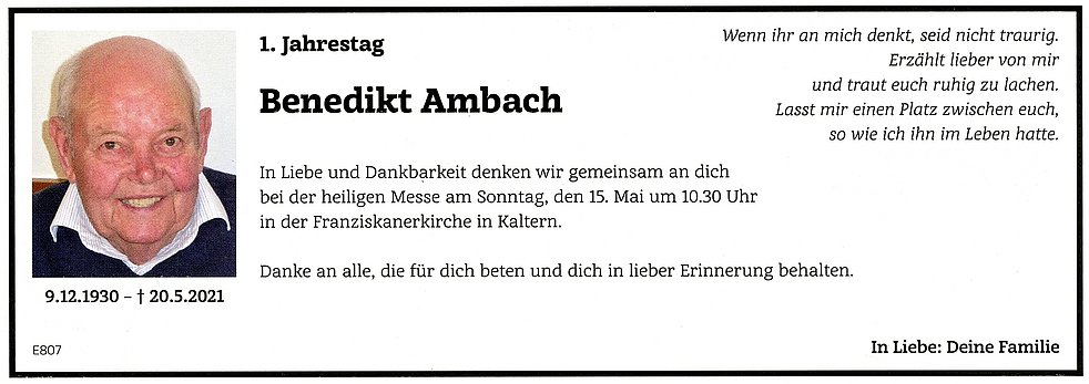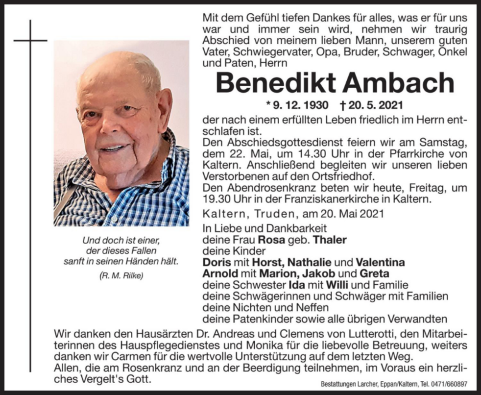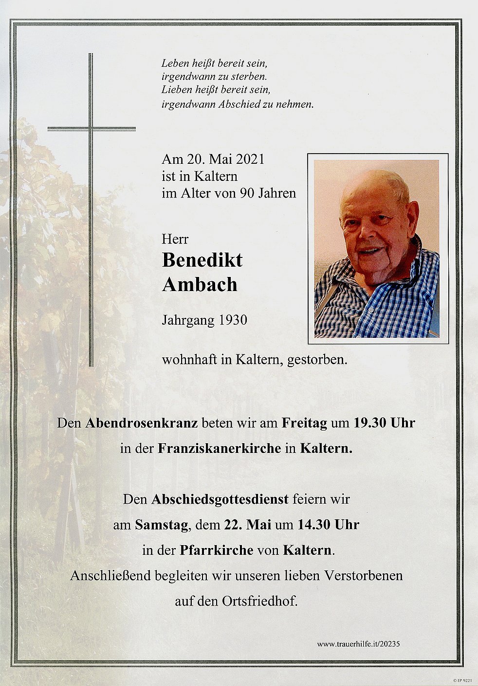 Den Abschiedsgottesdienst feiern wir am Samstag, dem 22. Mai um 14.30 Uhr in der Pfarrkirche von Kaltern. Anschließend begleiten wir unseren lieben Verstorbenen auf den Ortsfriedhof.