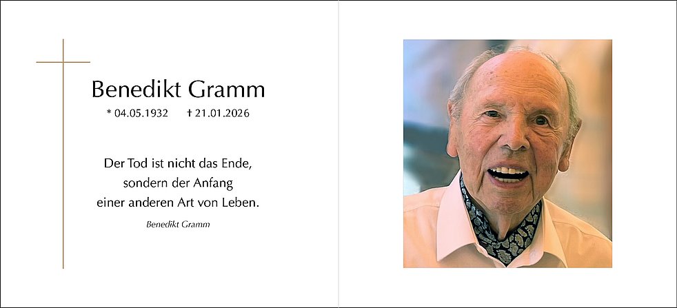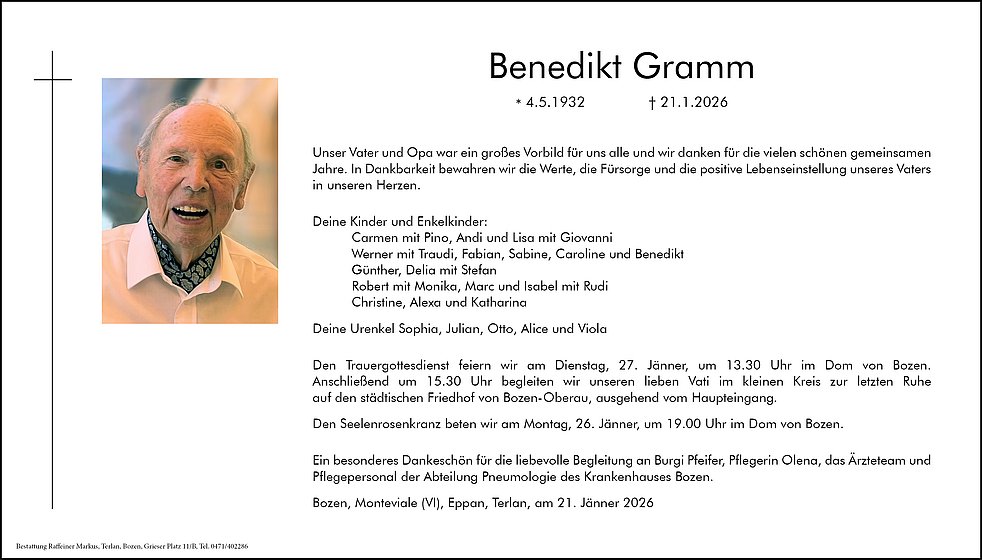 Den Trauergottesdienst feiern wir am Dienstag, 27. Jänner, um 13.30 Uhr im Dom von Bozen. Anschließend um 15.30 Uhr begleiten wir unseren lieben Vati im kleinen Kreis zur letzten Ruhe auf den städtischen Friedhof von Bozen-Oberau, ausgehend vom Haupteingang.