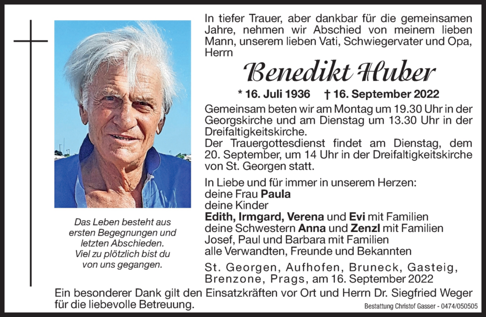 Benedikt wurde 1936 als 2. von 7 Kindern in St. Georgen geboren. Seine Eltern waren angenehme, gutmütige Menschen, von denen er wohl seine feine Art erbte.