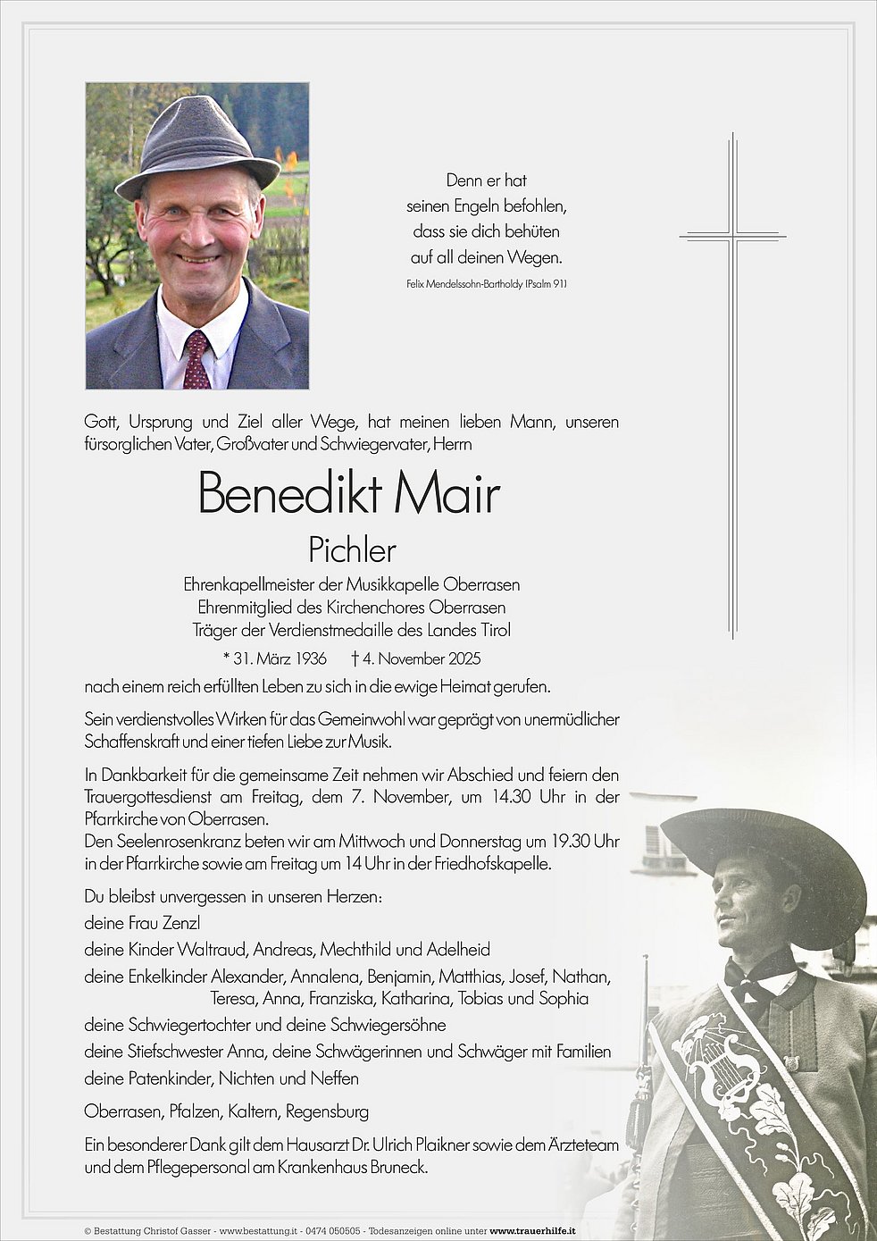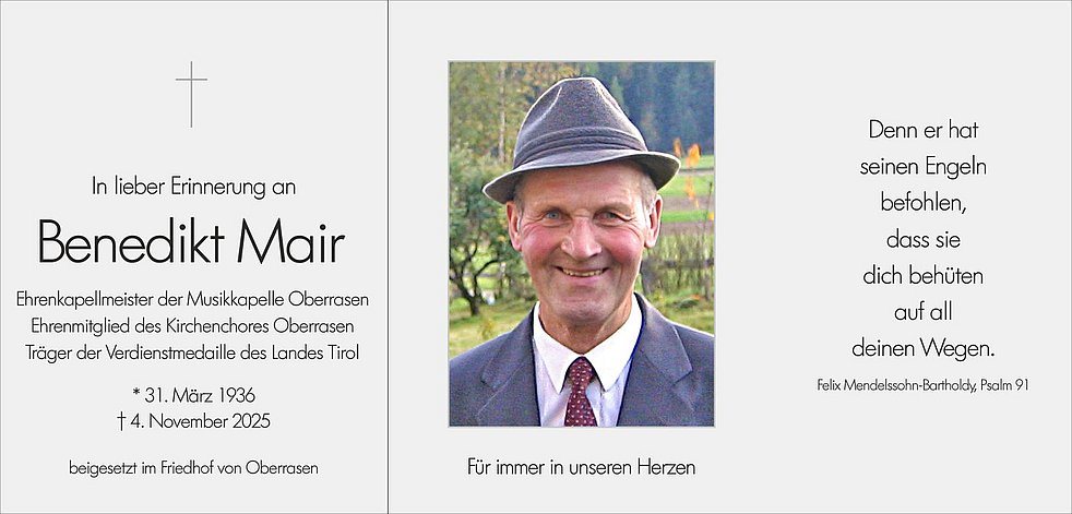 In Dankbarkeit für die gemeinsame Zeit nehmen wir Abschied und feiern den Trauergottesdienst am Freitag, dem 7. November, um 14.30 Uhr in der Pfarrkirche von Oberrasen.