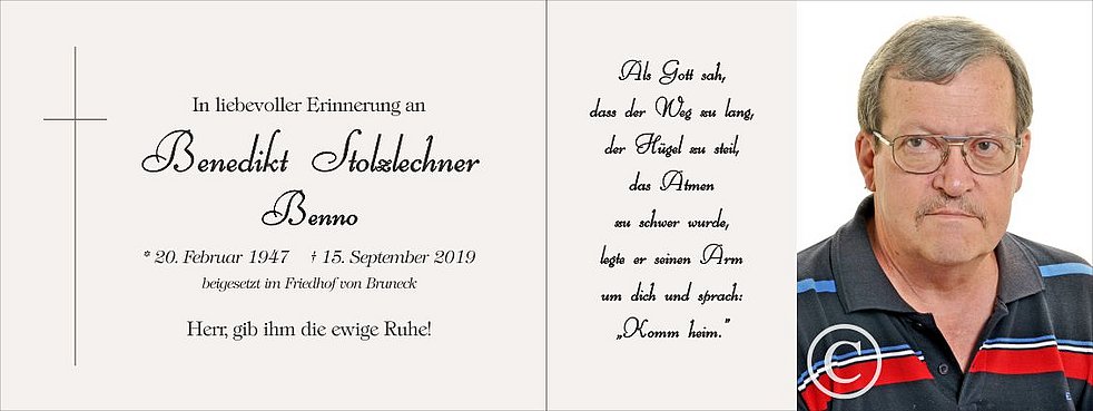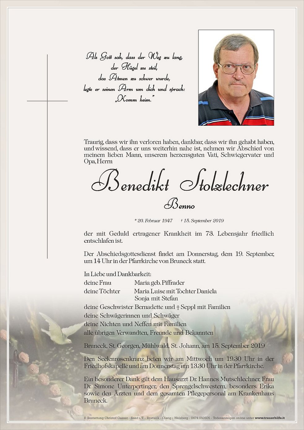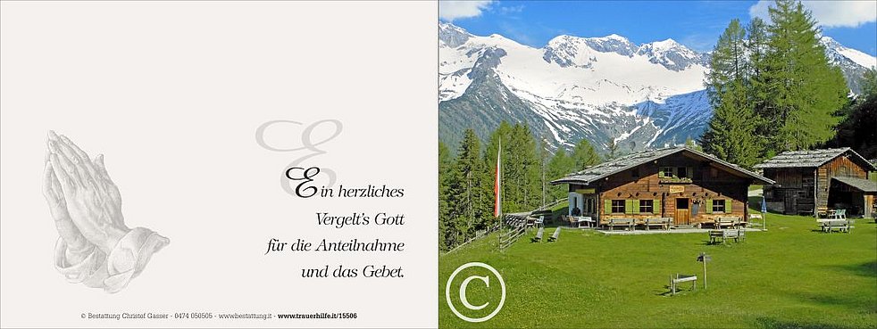 Ein besonderer Dank gilt dem Hausarzt Dr. Hannes Mutschlechner, Frau Dr. Simone Unterpertinger, den Sprengelschwestern, besonders Erika sowie den Ärzten und dem gesamten Pflegepersonal am Krankenhaus Bruneck.