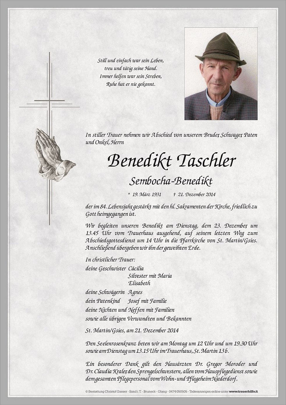 Wir begleiten unseren Benedikt am Dienstag, dem 23. Dezember, um 13.45 Uhr vom Trauerhaus ausgehend, auf seinem letzten Weg zum Abschiedsgottesdienst um 14 Uhr in die Pfarrkirche von St. Martin/Gsies. Anschließend übergeben wir ihn der geweihten Erde.
