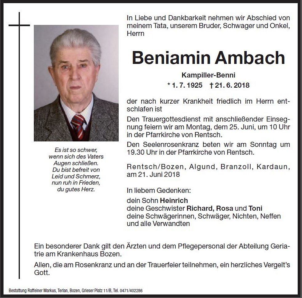 Den Trauergottesdienst mit anschließender Einsegnung feiern wir am Montag, dem 25. Juni, um 10 Uhr in der Pfarrkirche von Rentsch.