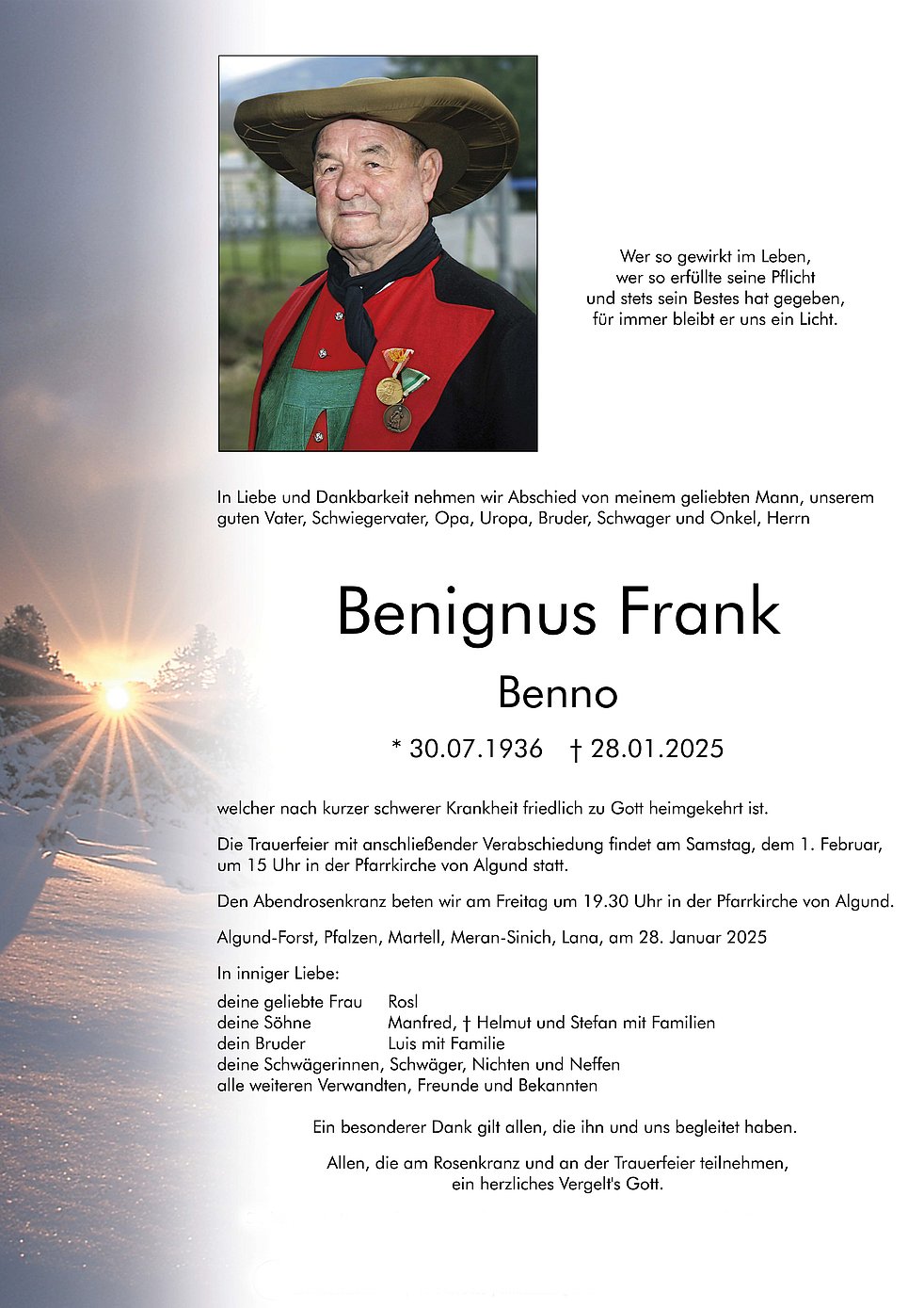 Die Trauerfeier mit anschließender Verabschiedung findet am Samstag, dem 1. Februar, um 15 Uhr in der Pfarrkirche von Algund statt.