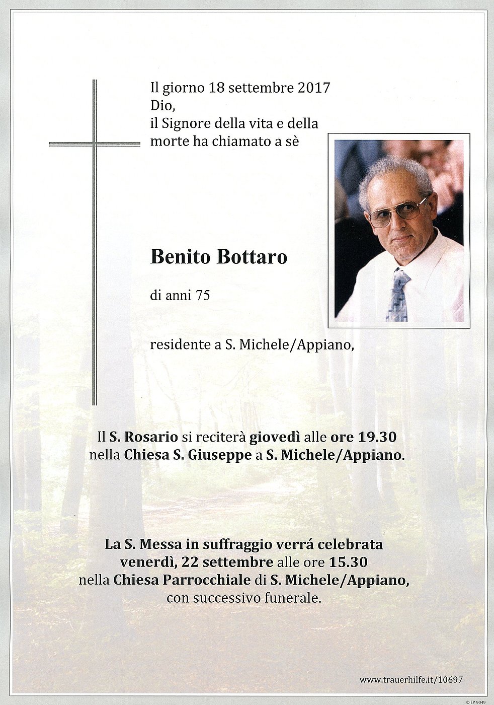 La S. Messa in suffragio verrà celebrata venerdì 22 settembre alle ore 15.30 nella chiesa parrocchiale di S. Michele/Appiano con successivo funerale. Il S. Rosario verrà recitato giovedì alle ore 19.30 nella chiesa S. Giuseppe a S. Michele/Appiano.