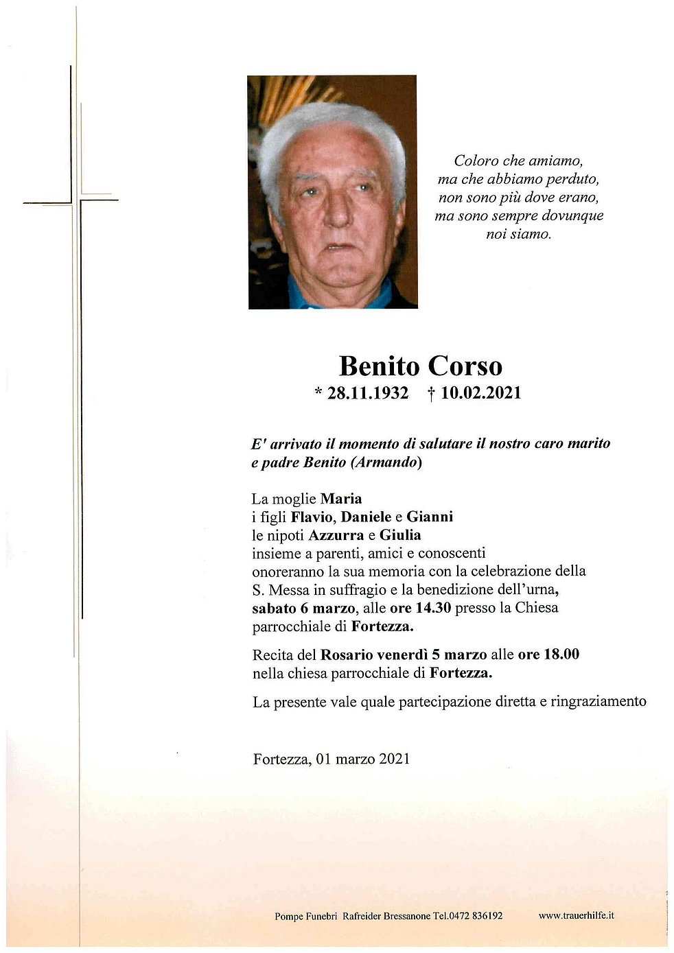onoreranno la sua memoria con la celebrazione della S. Messa in suffragio e la benedizione dell’urna, sabato 6 marzo, alle ore 14.30 presso la Chiesa parrocchiale di Fortezza.