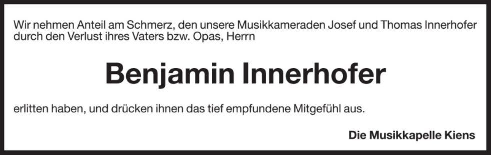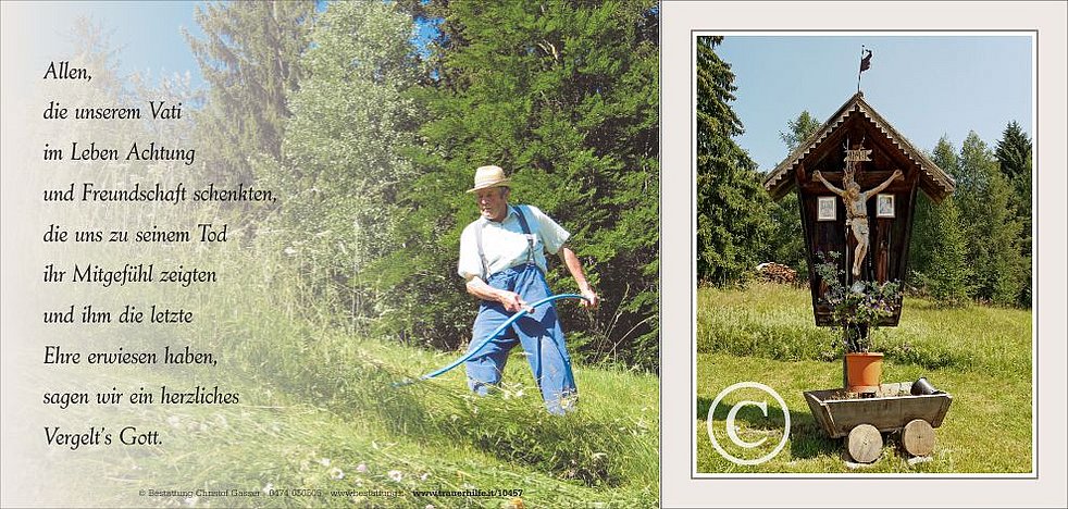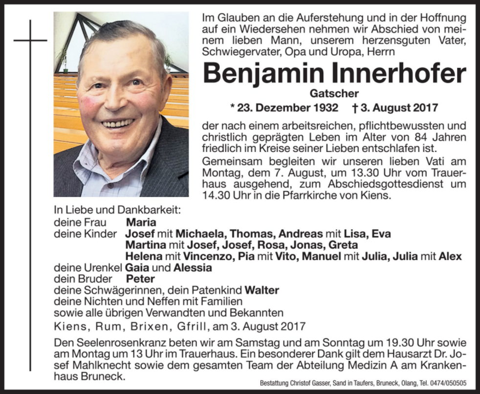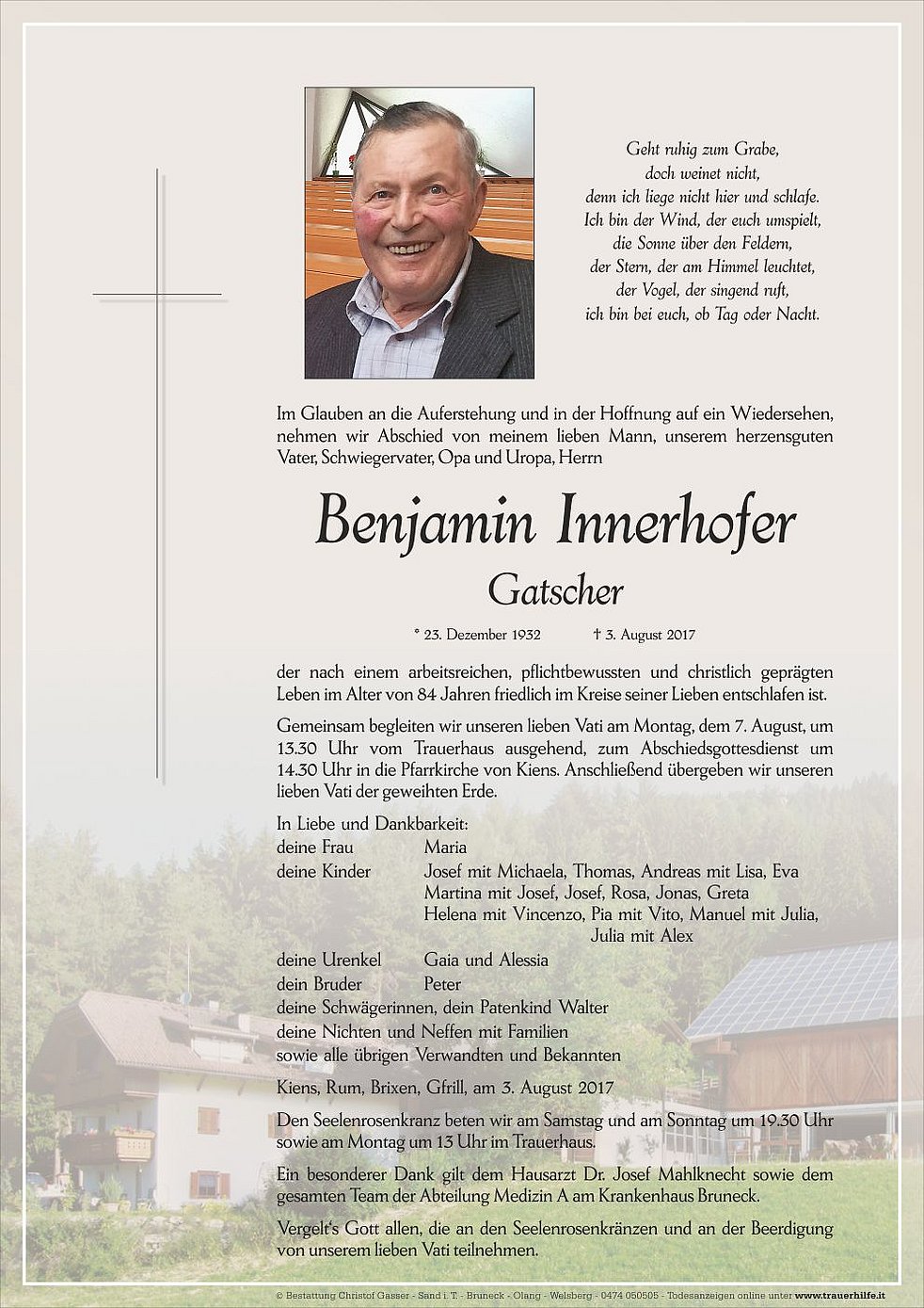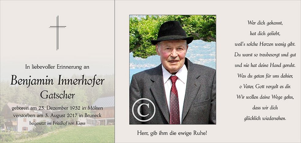 Gemeinsam begleiten wir unseren lieben Vati am Montag, dem 7. August, um 13.30 Uhr vom Trauerhaus ausgehend, zum Abschiedsgottesdienst um 14.30 Uhr in die Pfarrkirche von Kiens. Anschließend übergeben wir unseren lieben Vati der geweihten Erde.