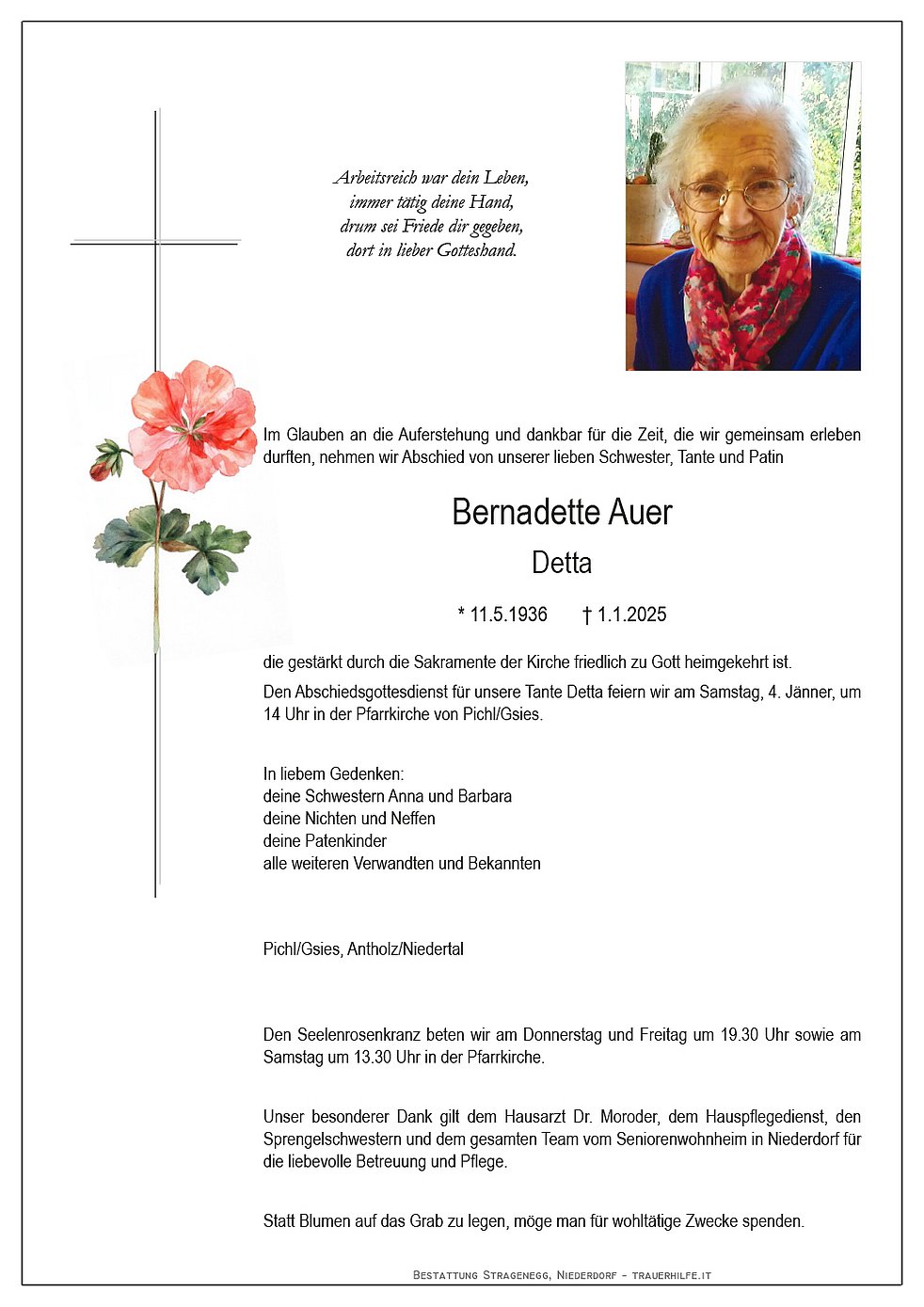Detta i bin gearn zi dir und deindo Schweschto Barbara ins Gsies gfohrn du bisch a Herznsguita und fröhlicha Frau gewedn. I und do Jakob hom ins ba dir olm sehr wohl gfühlt
