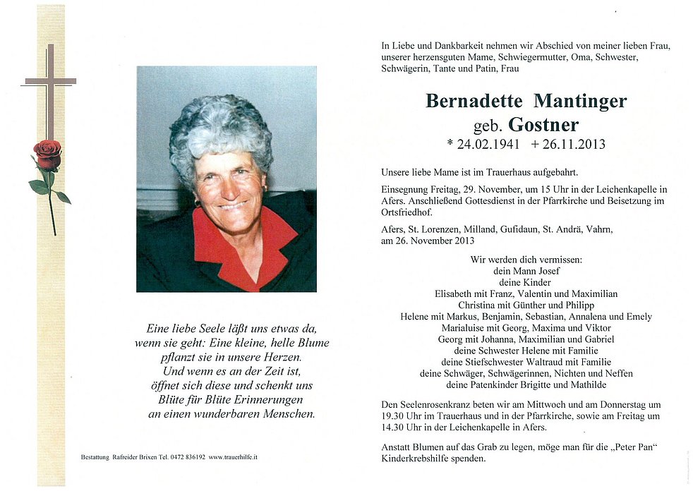 Einsegnung Freitag, 29. November, um 15 Uhr in der Leichenkapelle in Afers. Anschließend Gottesdienst in der Pfarrkirche und Beisetzung im Ortsfriedhof.