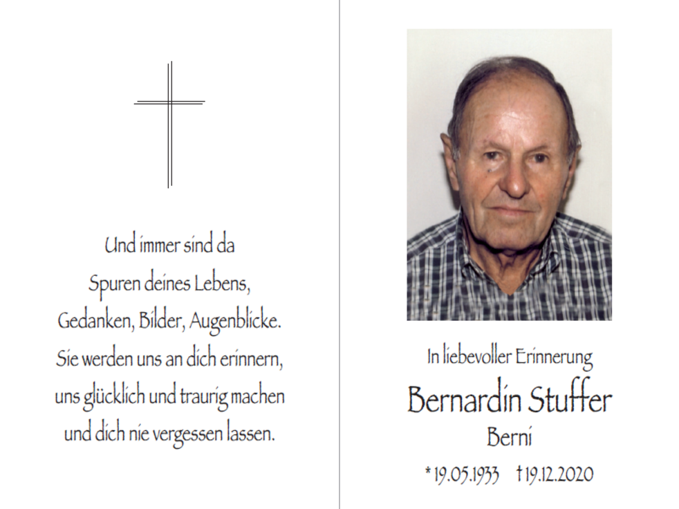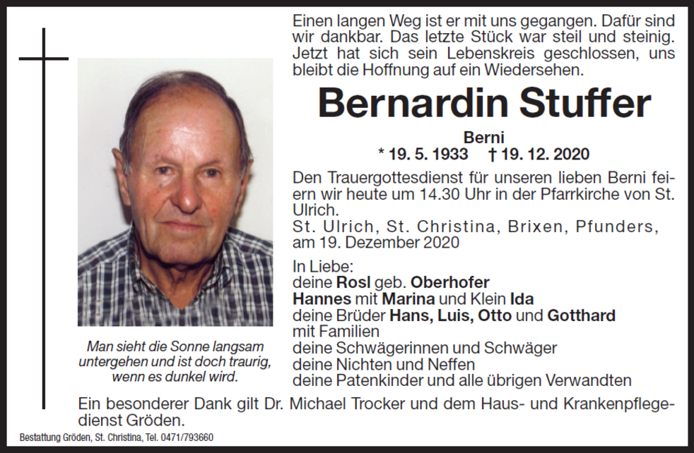 Den Trauergottesdienst für unseren lieben Berni feiern wir am Montag, dem 21. Dezember, um 14.30 Uhr in der Pfarrkirche von St. Ulrich.