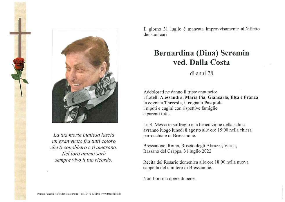 La S. Messa in suffragio e la benedizione della salma avranno luogo lunedì 8 agosto alle ore 15:00 nella chiesa parrocchiale di Bressanone.