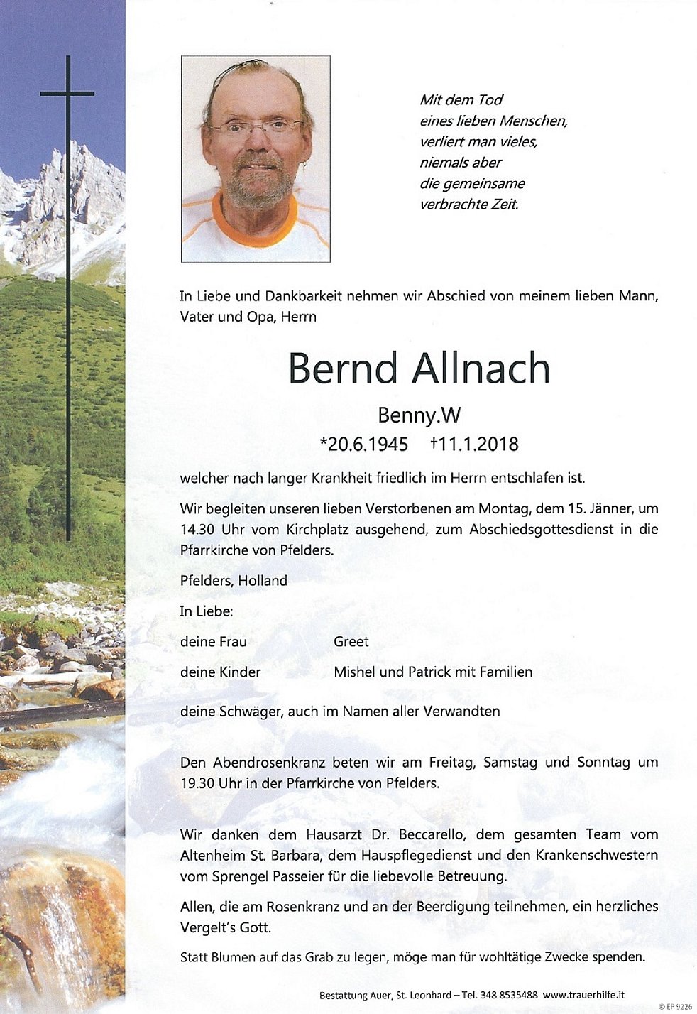 Wir begleiten unseren lieben Verstorbenen am Montag, dem 15. Jänner, um 14.30 Uhr vom Kirchplatz ausgehend, zum Abschiedsgottesdienst in die Pfarrkirche von Pfelders.