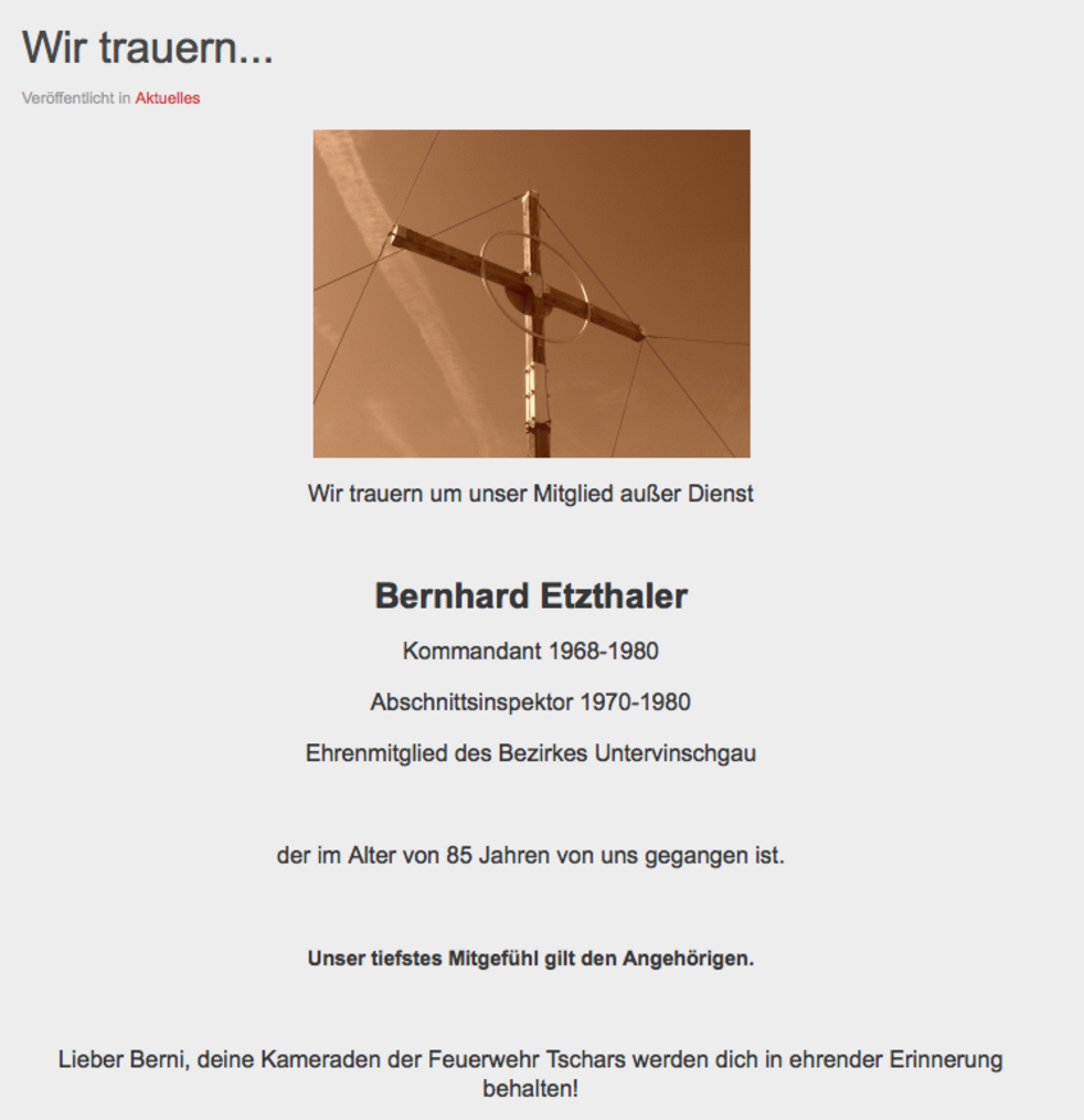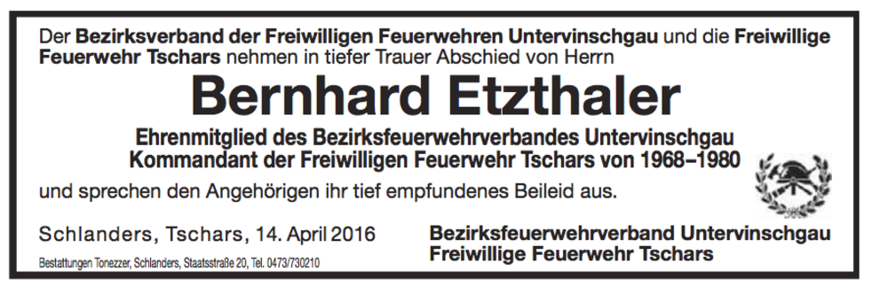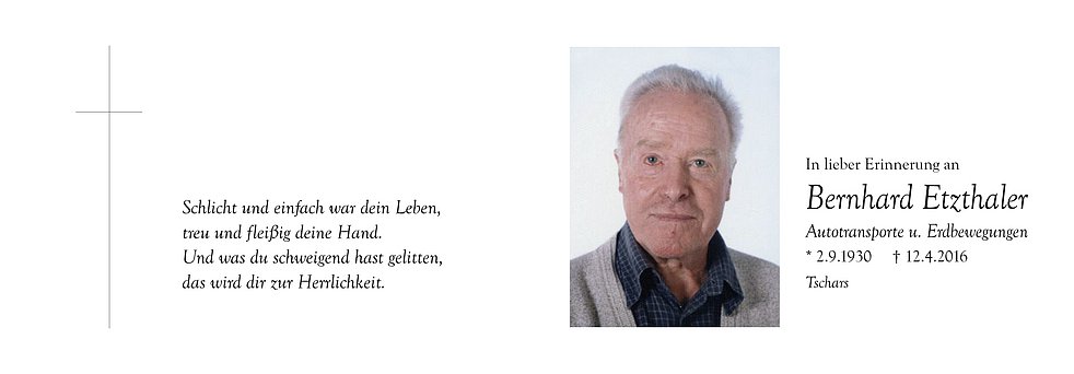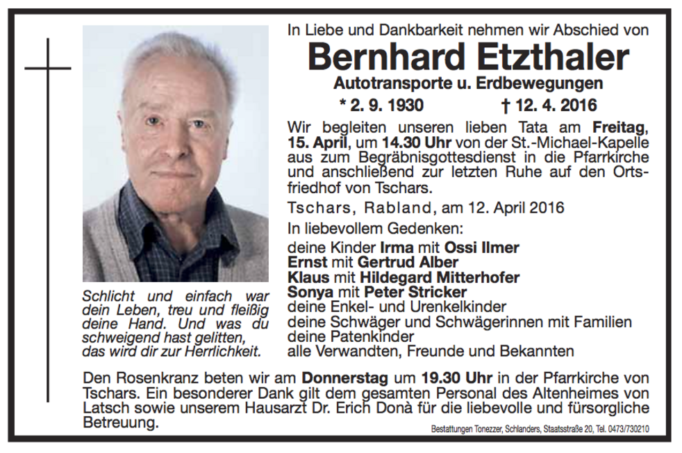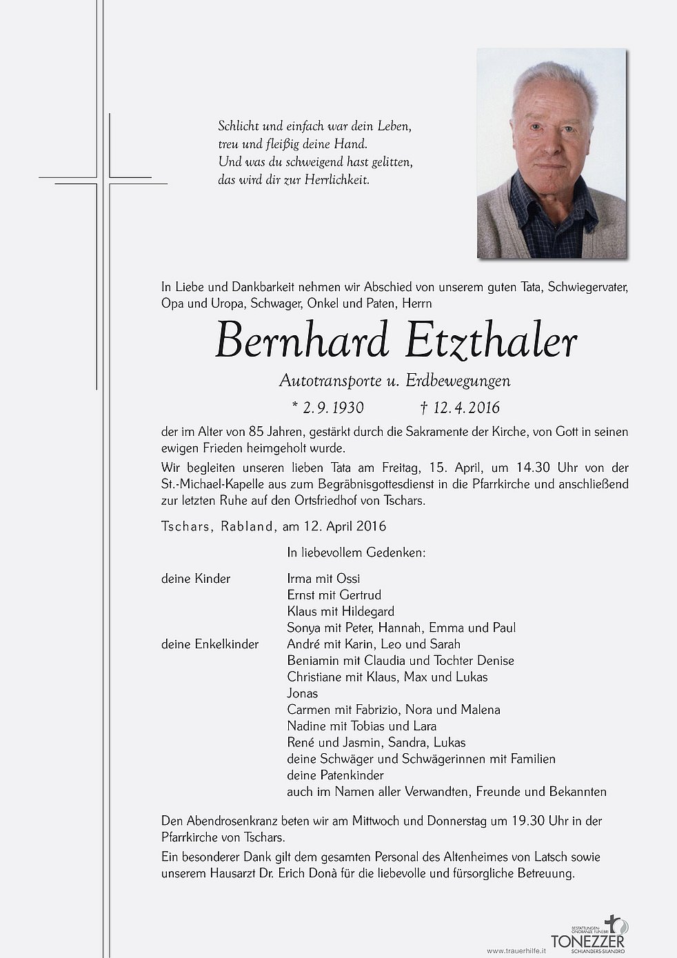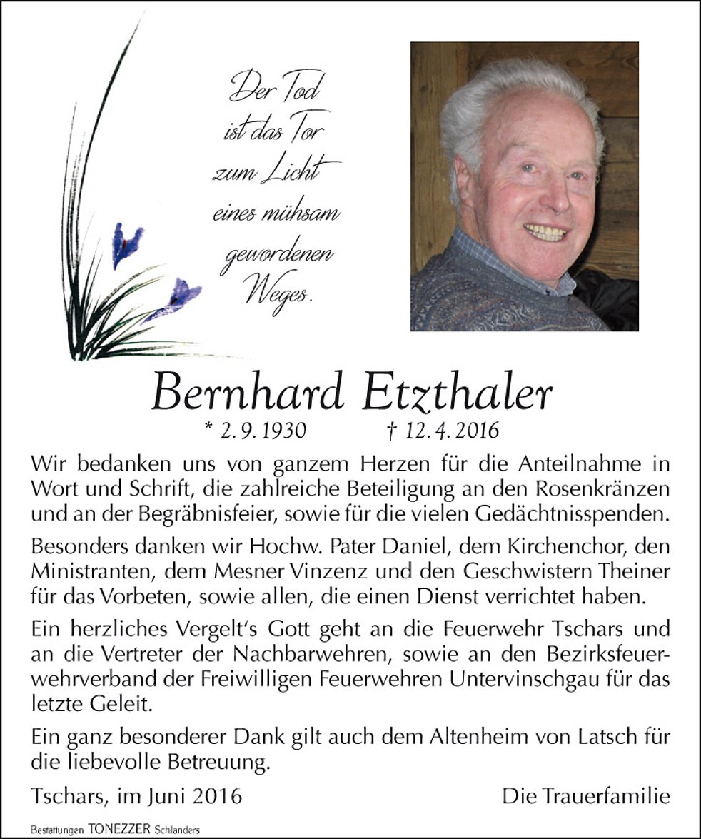 Ein besonderer Dank gilt dem gesamten Personal des Altenheimes von Latsch sowie unserem Hausarzt Dr. Erich Donà für die liebevolle und fürsorgliche Betreuung.