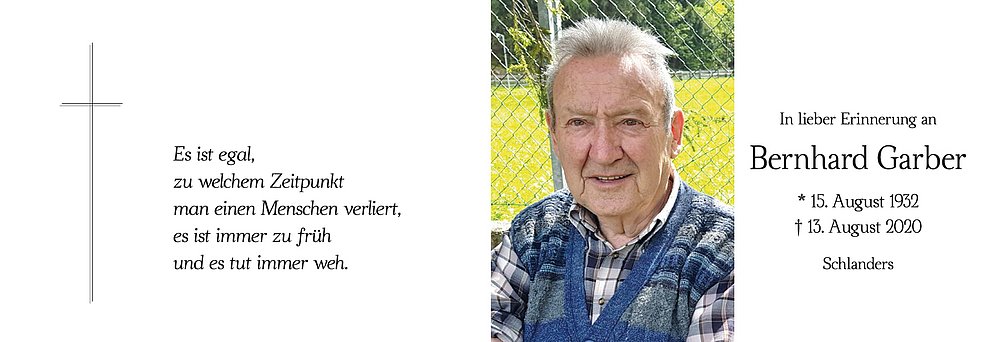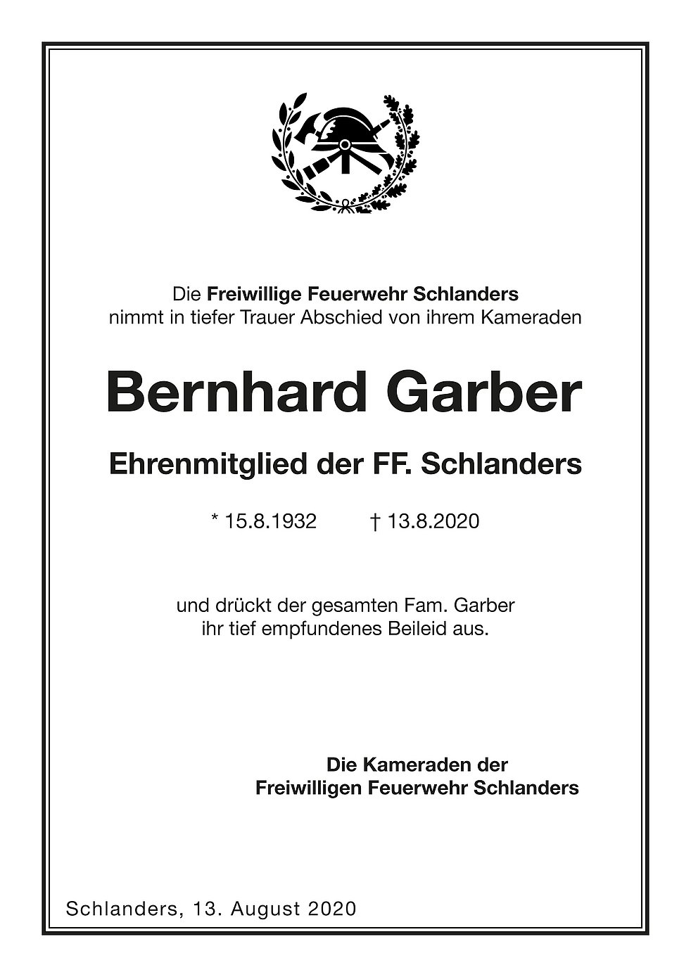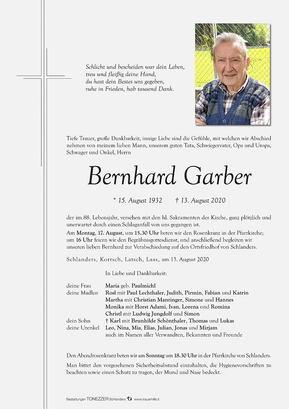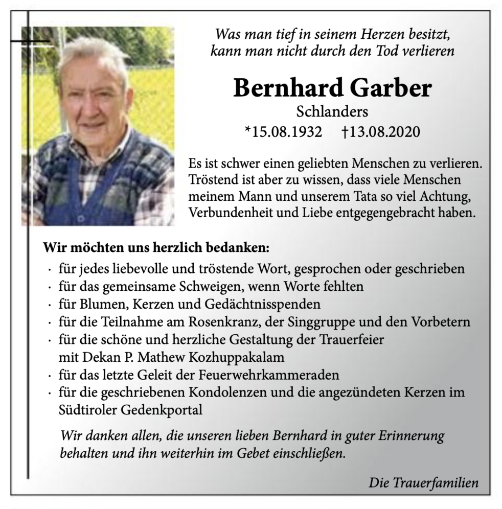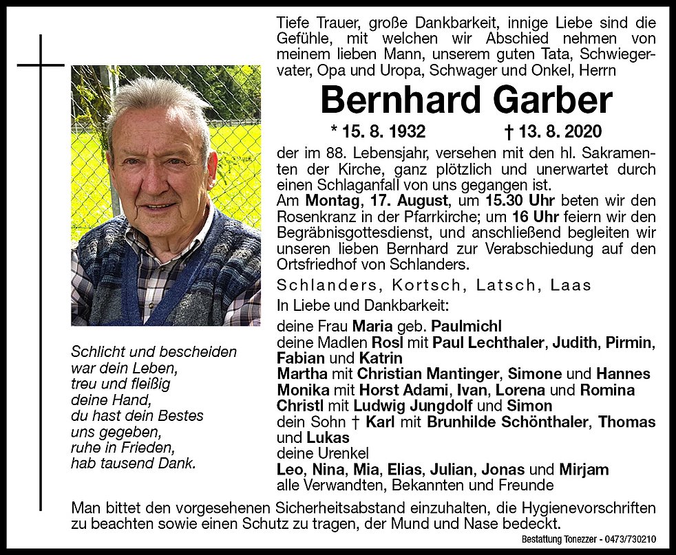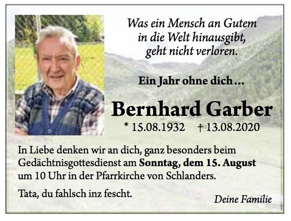 Am Montag, 17. August, um 15.30 Uhr beten wir den Rosenkranz in der Pfarrkirche; um 16 Uhr feiern wir den Begräbnisgottesdienst, und anschließend begleiten wir unseren lieben Bernhard zur Verabschiedung auf den Ortsfriedhof von Schlanders.