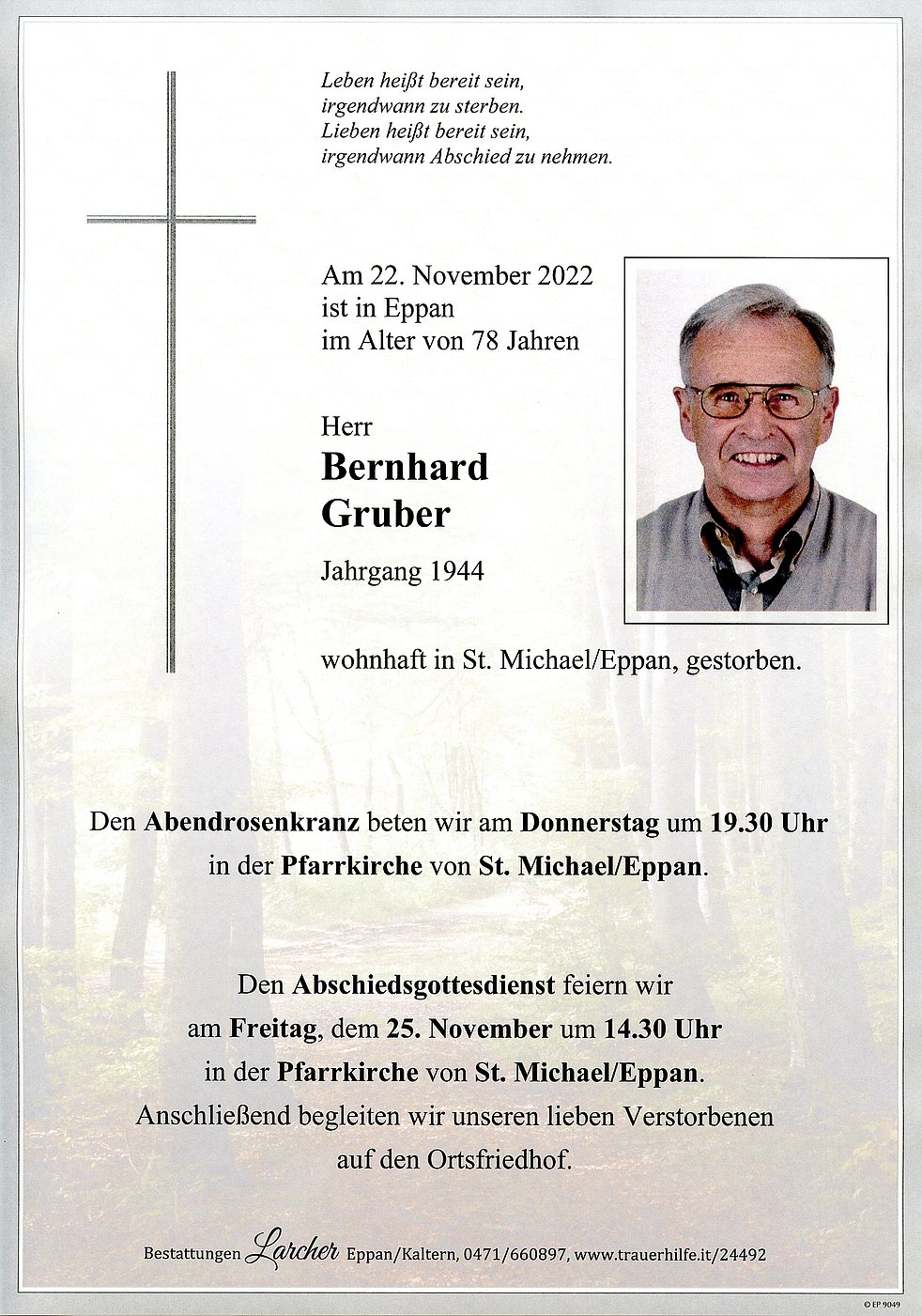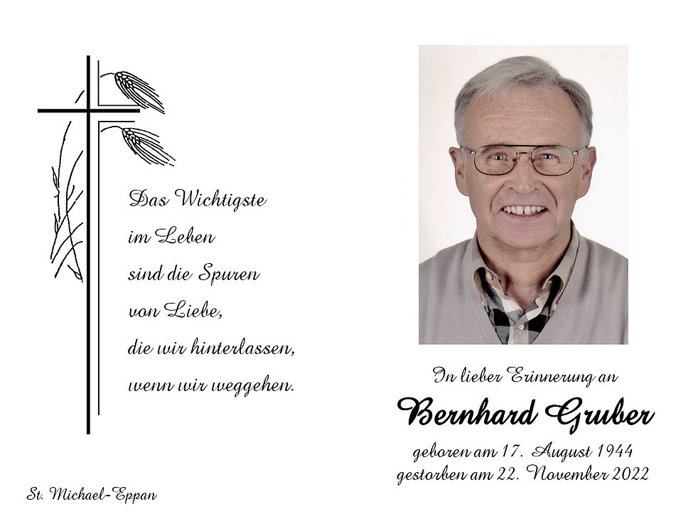 Den Abschiedsgottesdienst feiern wir am Freitag, dem 25. November um 14.30 Uhr in der Pfarrkirche von St. Michael/Eppan. Anschließend begleiten wir unseren lieben Verstorbenen auf den Ortsfriedhof.
