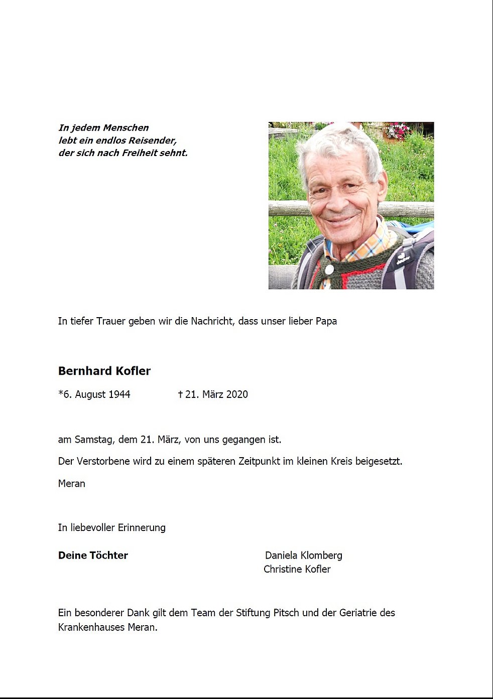 Wir nehmen Anteil an der Trauer um Euren Vater und bekunden unser aufrichtes Mitgefühl
