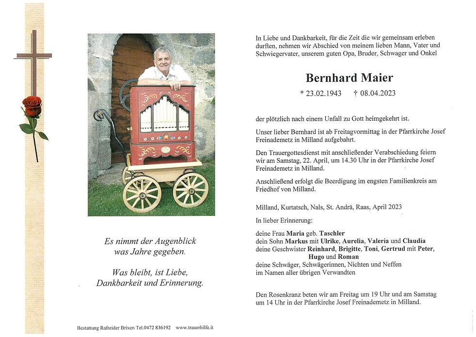 Wenn die Sonne des Lebens untergeht leuchten die Sterne der Erinnerung. Jahrelang durfte ich dich an deinen Geburtstag besuchen. Jedes Jahr spieltest du auf den Weihnachtsmarkt mit deiner Drehorgel.Du wirst miar fehlen. Mochs guat Benni