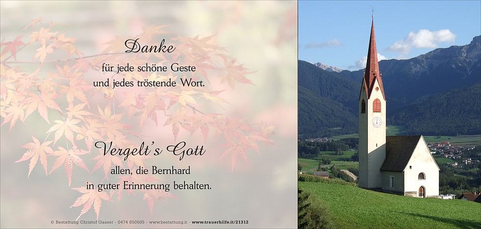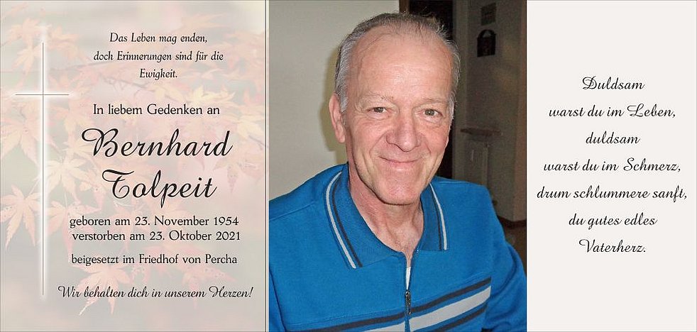 Den Trauergottesdienst, mit anschließender Verabschiedung, feiern wir am Dienstag, dem 26. Oktober, um 13.30 Uhr in der Pfarrkirche von Percha.