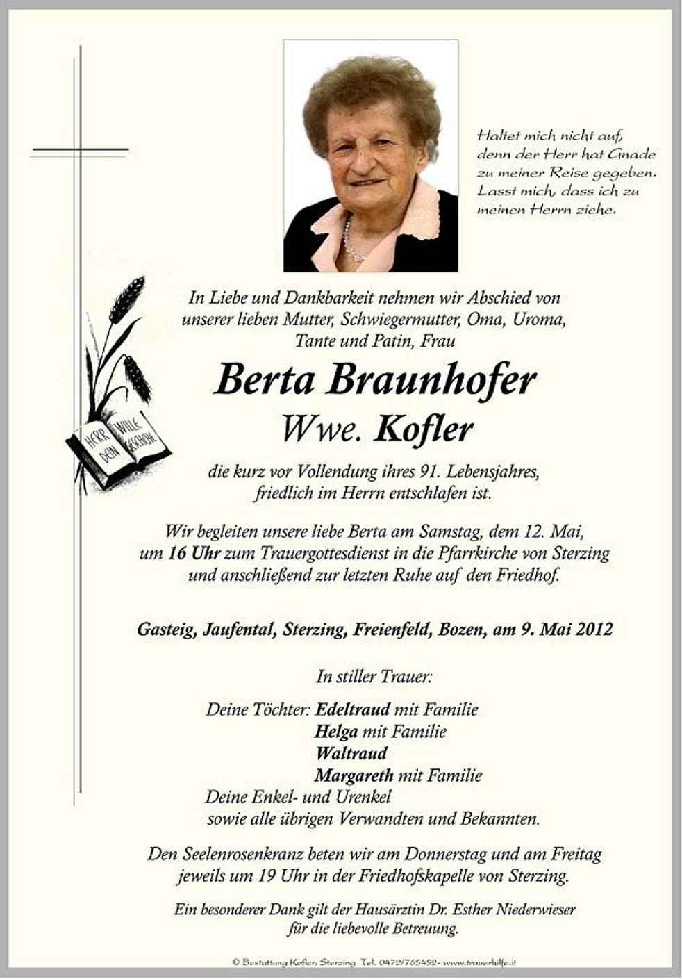 Wir begleiten unsere liebe Berta am Samstag, dem 12. Mai,