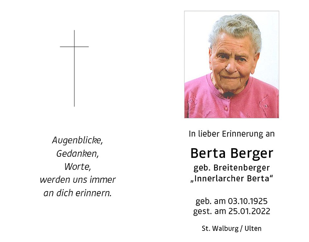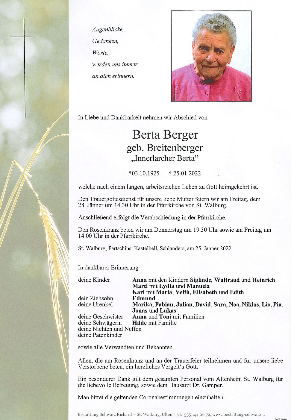Den Trauergottesdienst für unsere liebe Mutter feiern wir am Freitag, dem 28. Jänner um 14.30 Uhr in der Pfarrkirche von St. Walburg.