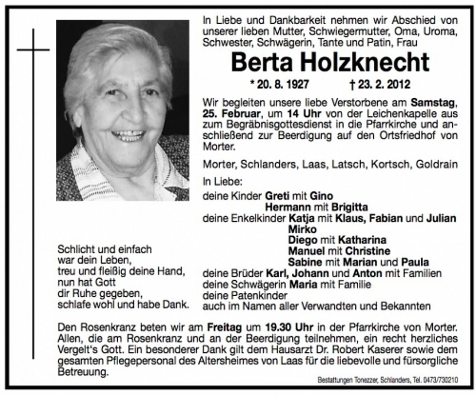 meine aufrichtige Anteilnahme am Tod von Berta Holzknecht.