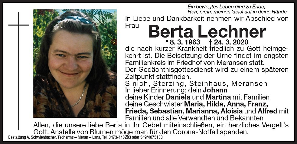 Die Beisetzung der Urne findet im engsten Familienkreis im Friedhof von Meransen statt.