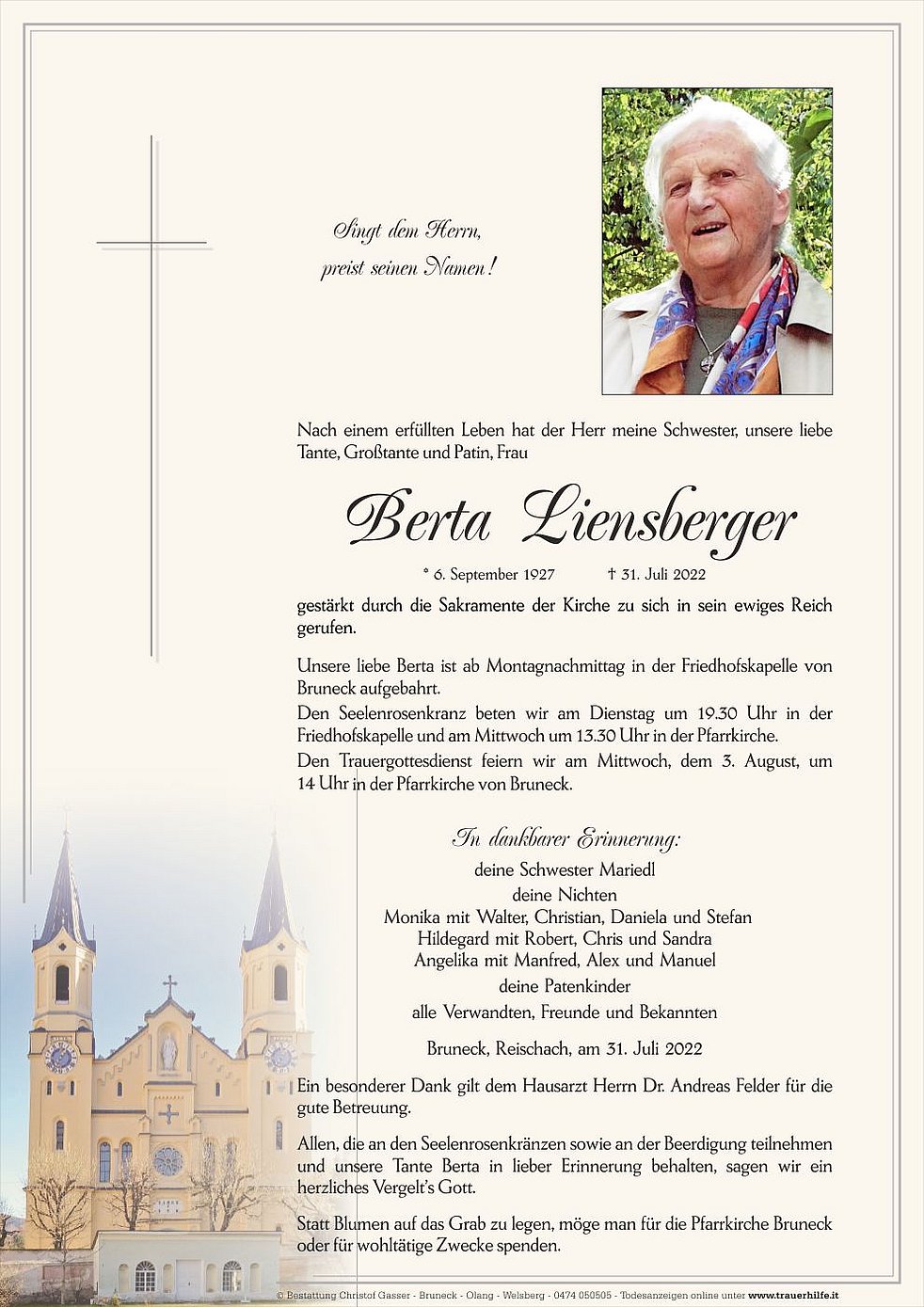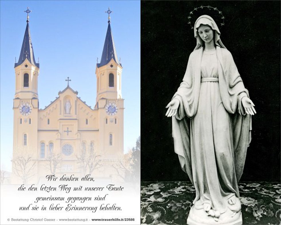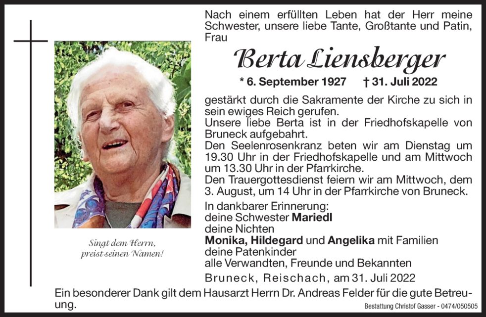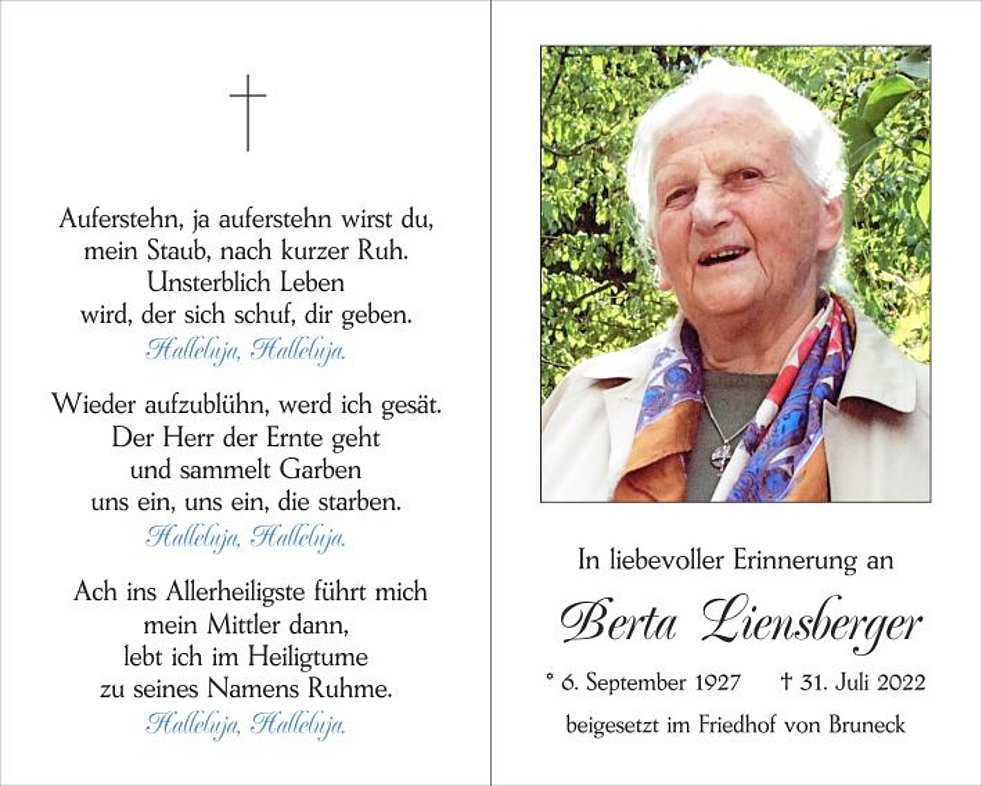 Allen, die an den Seelenrosenkränzen sowie an der Beerdigung teilnehmen und unsere Tante Berta in lieber Erinnerung behalten, sagen wir ein herzliches Vergelt’s Gott.