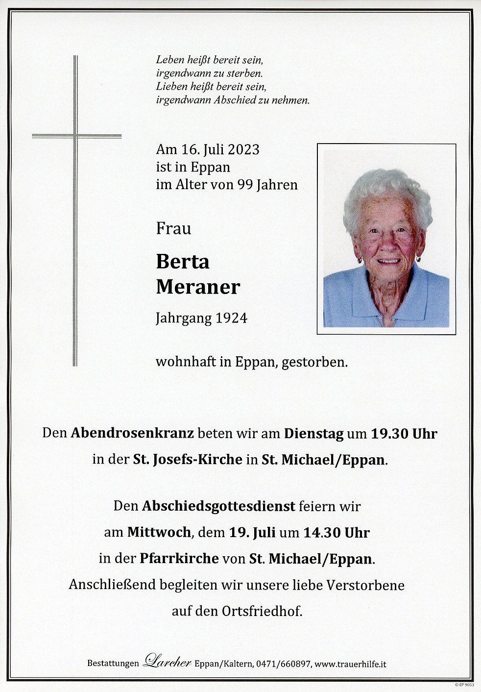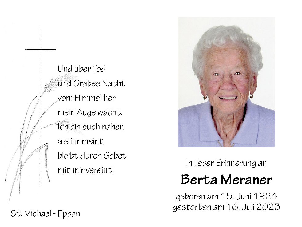 Den Abschiedsgottesdienst feiern wir am Mittwoch, 19. Juli um 14.30 Uhr in der Pfarrkirche von St. Michael/Eppan. Anschließend begleiten wir unsere liebe Verstorbene auf den Ortsfriedhof.