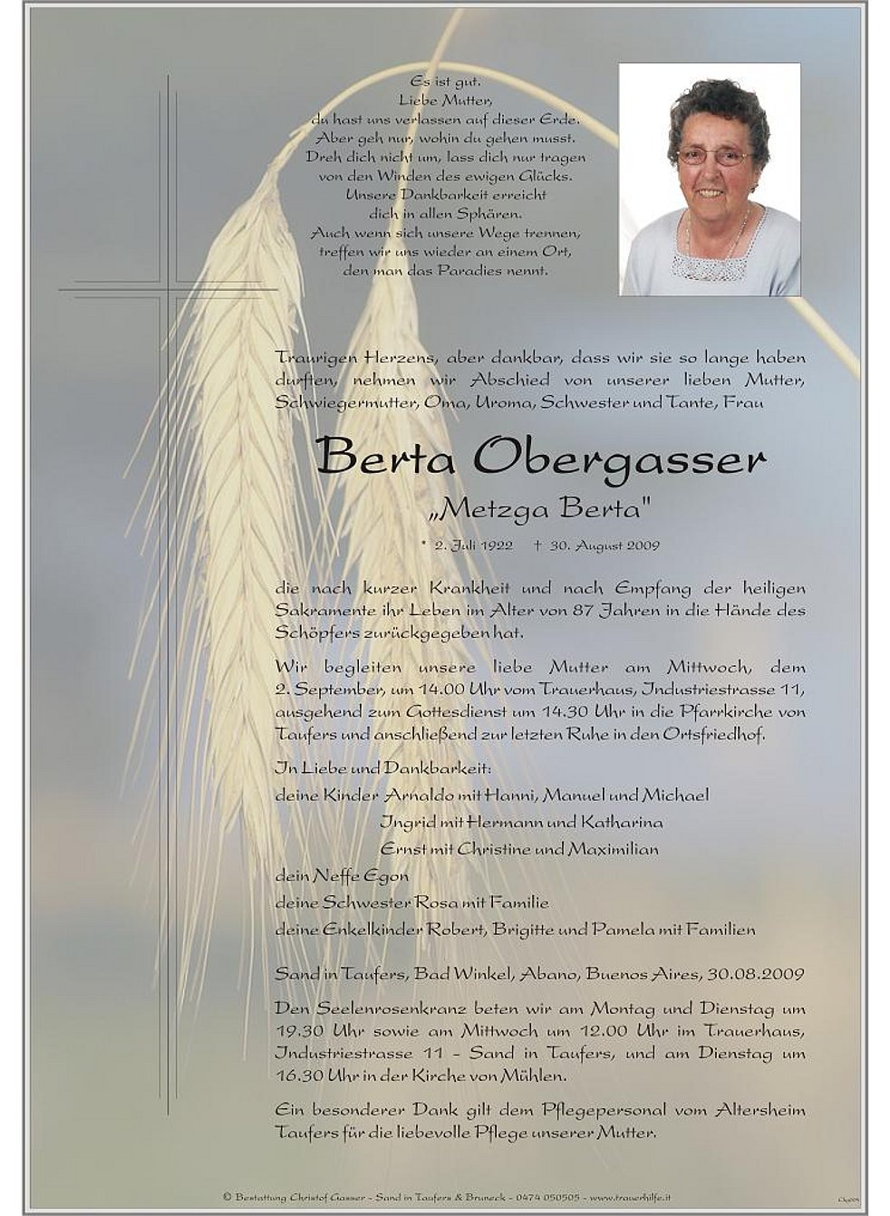 Ein besonderer Dank gilt dem Pflegepersonal vom Altersheim Taufers für die liebevolle Pflege unserer Mutter.