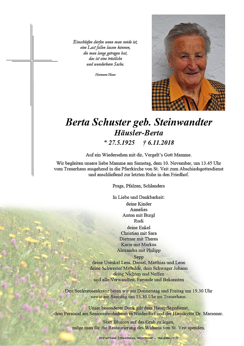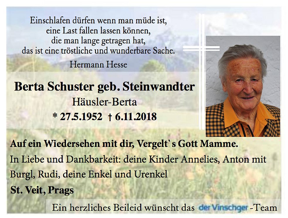 Wir begleiten unsere liebe Mamme am Samstag, dem 10. November, um 13.45 Uhr vom Trauerhaus ausgehend in die Pfarrkirche von St. Veit zum Abschiedsgottesdienst und anschließend zur letzten Ruhe in den Friedhof.