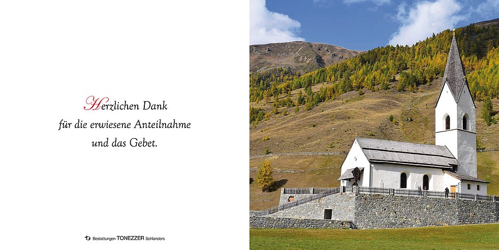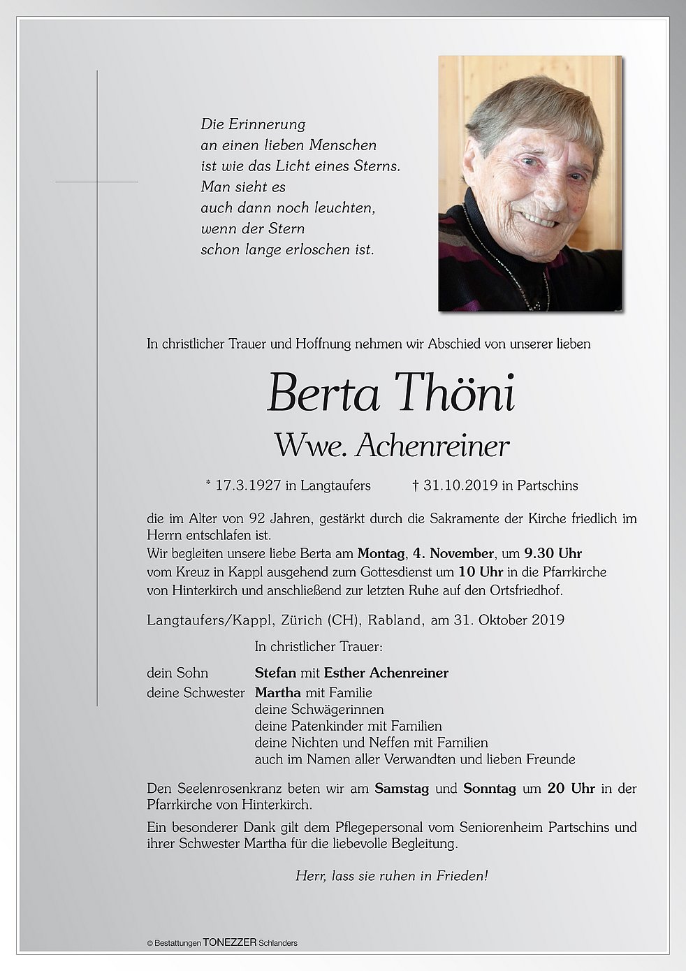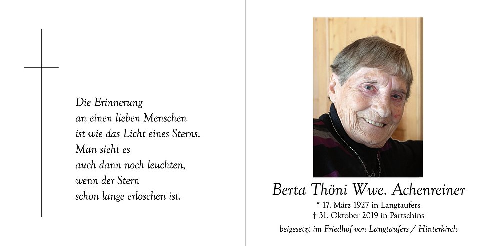 Ein besonderer Dank gilt dem Pflegepersonal vom Seniorenheim Partschins und ihrer Schwester Martha für die liebevolle Begleitung. Herr, lass sie ruhen in Frieden!