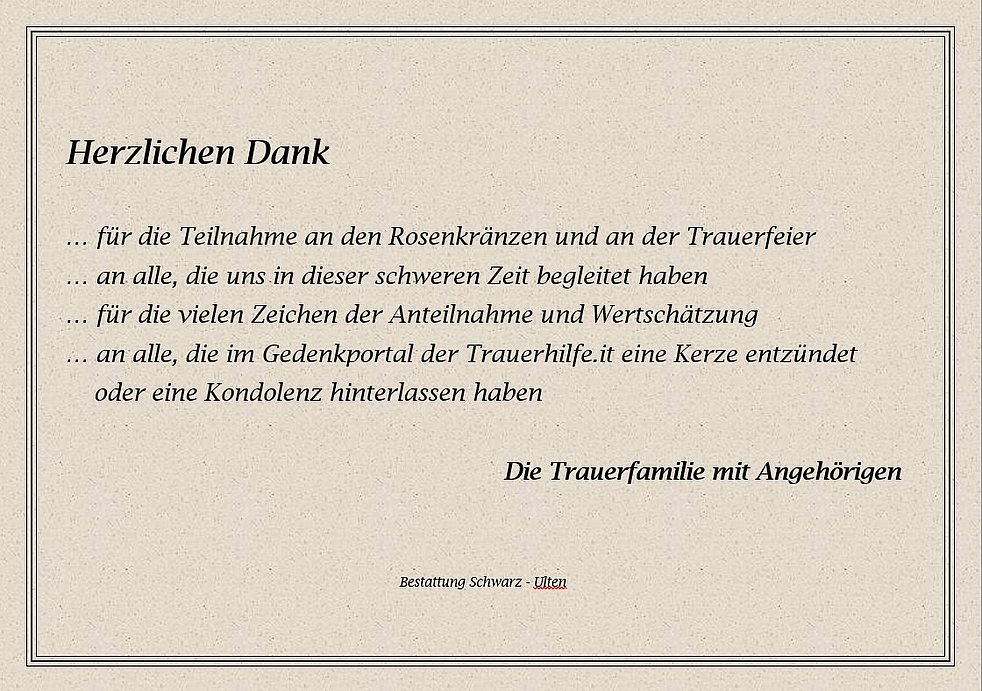 Wir danken dem gesamten Personal des Altenheimes St. Walburg für die liebevolle Betreuung, den Ärzten Dr. Gamper und Dr. Bachmann, sowie dem Hauspflegedienst des Gesundheitssprengels Lana.