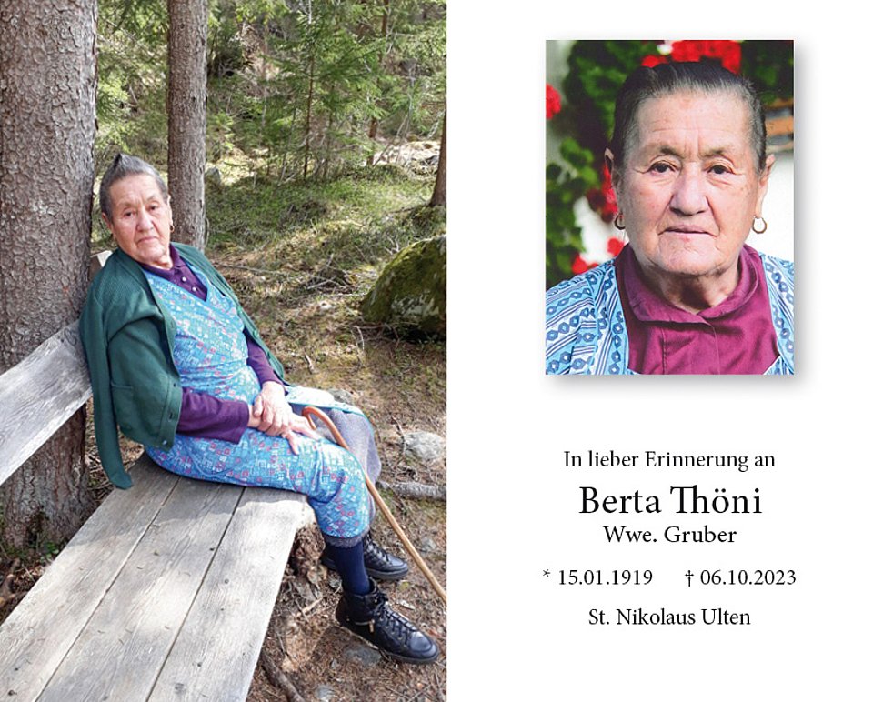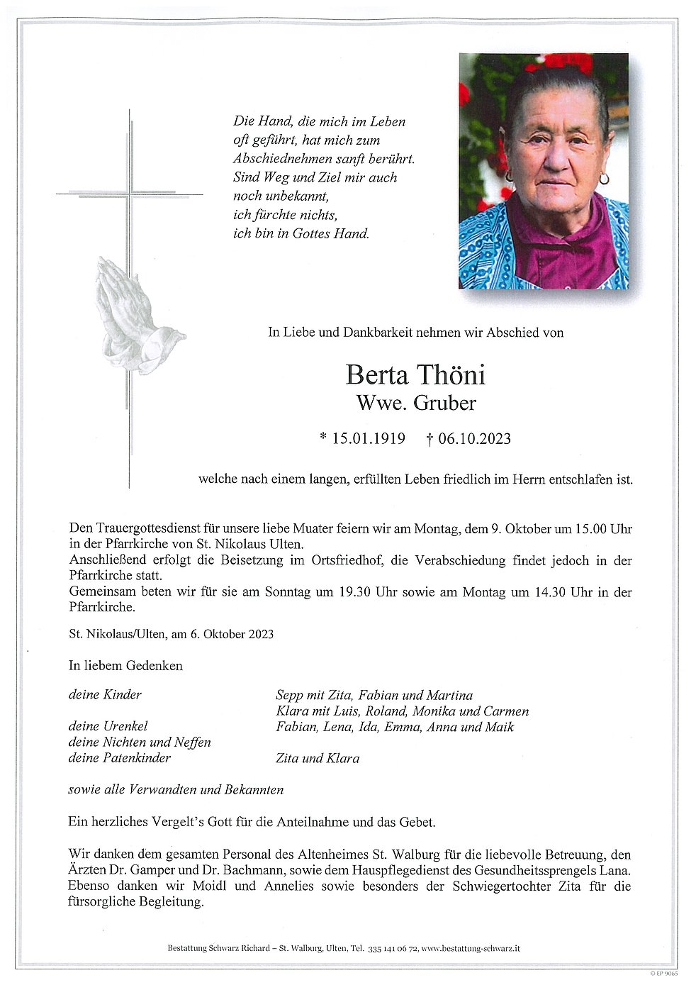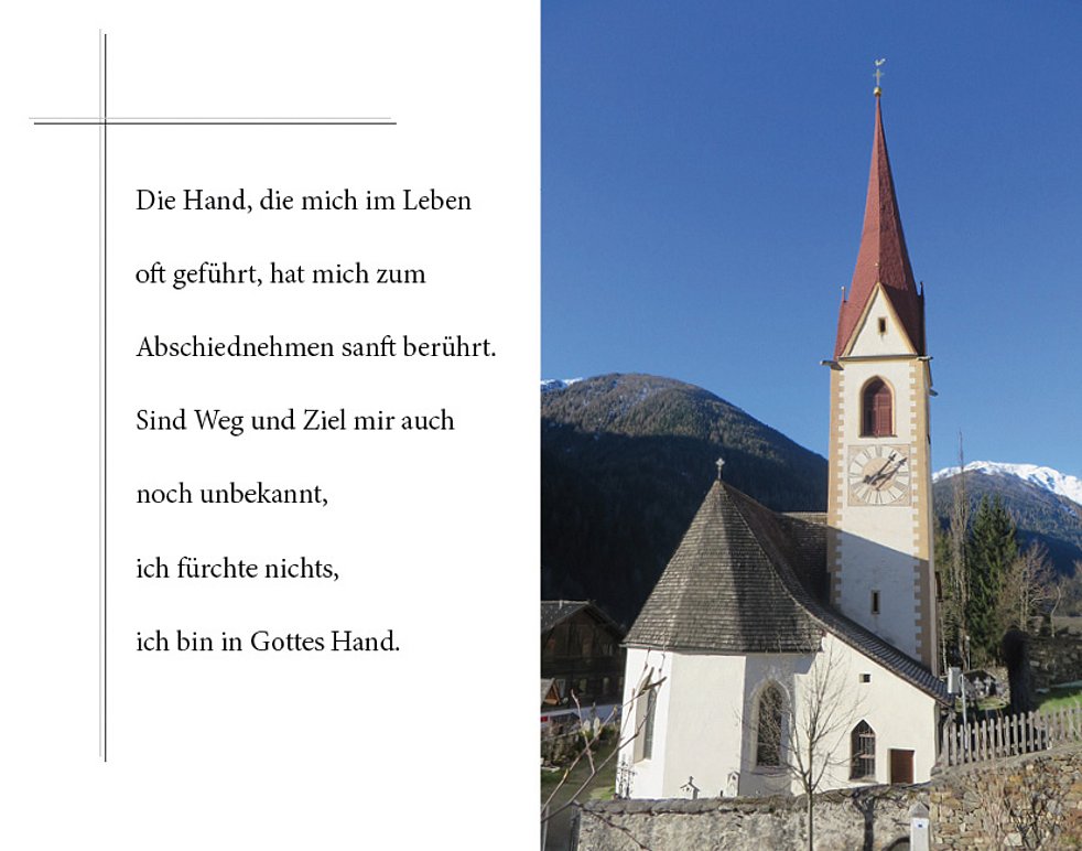 Den Trauergottesdienst für unsere liebe Muater feiern wir am Montag, dem 9. Oktober um 15.00 Uhr in der Pfarrkirche von St. Nikolaus Ulten.