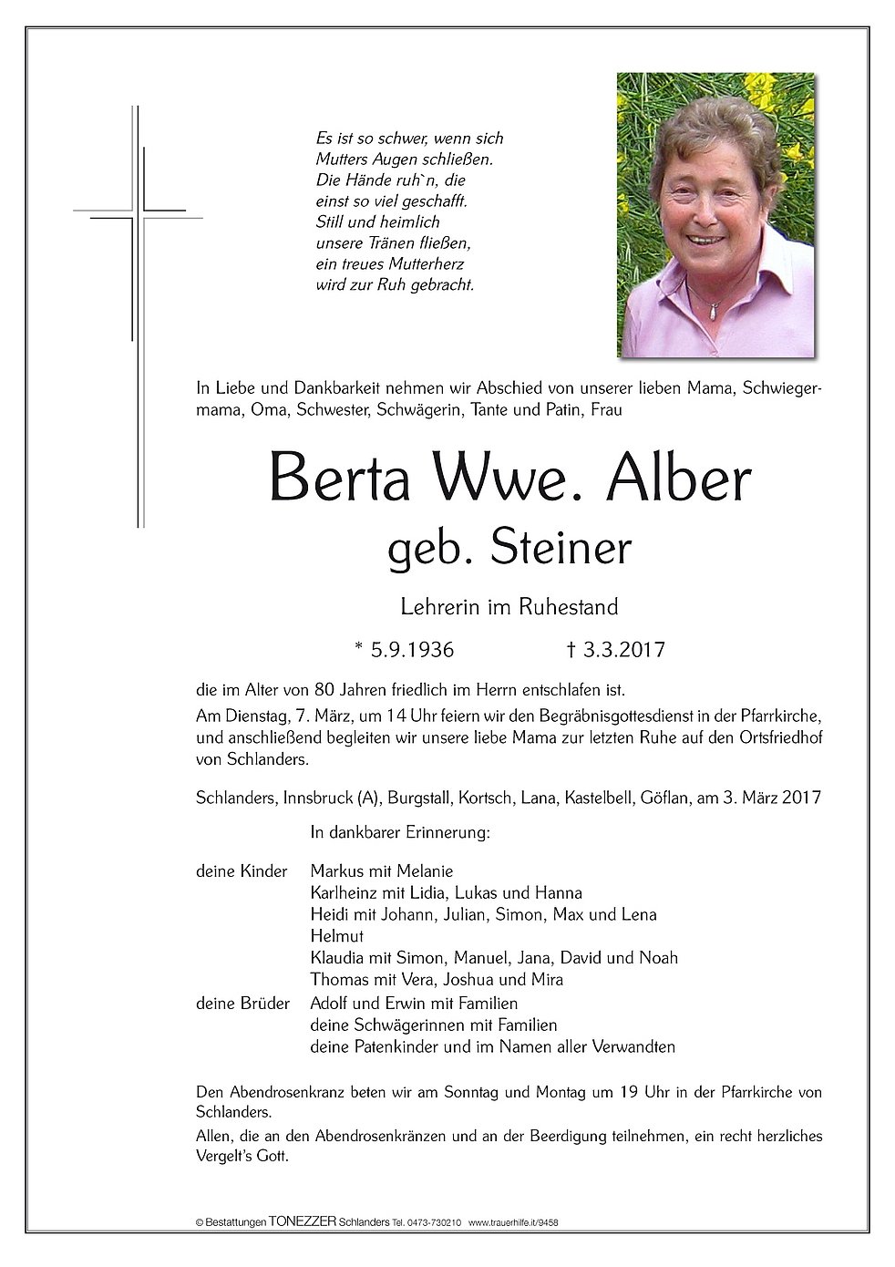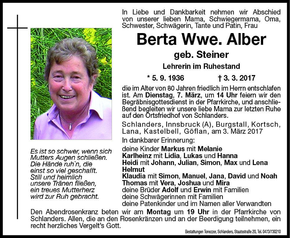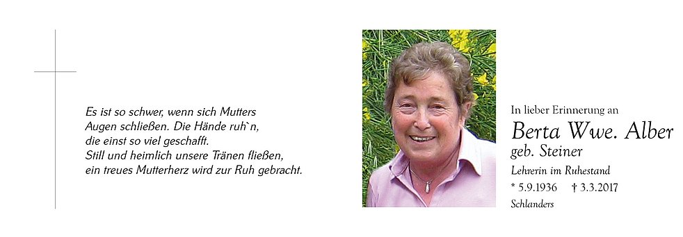 Am Dienstag, 7. März, um 14 Uhr feiern wir den Begräbnisgottesdienst in der Pfarrkirche, und anschließend begleiten wir unsere liebe Mama zur letzten Ruhe auf den Ortsfriedhof von Schlanders.