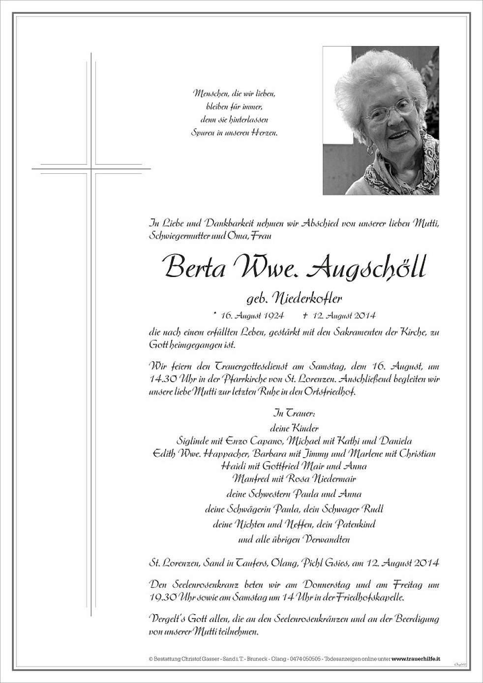 14.30 Uhr in der Pfarrkirche von St. Lorenzen. Anschließend begleiten wir unsere liebe Mutti zur letzten Ruhe in den Ortsfriedhof.