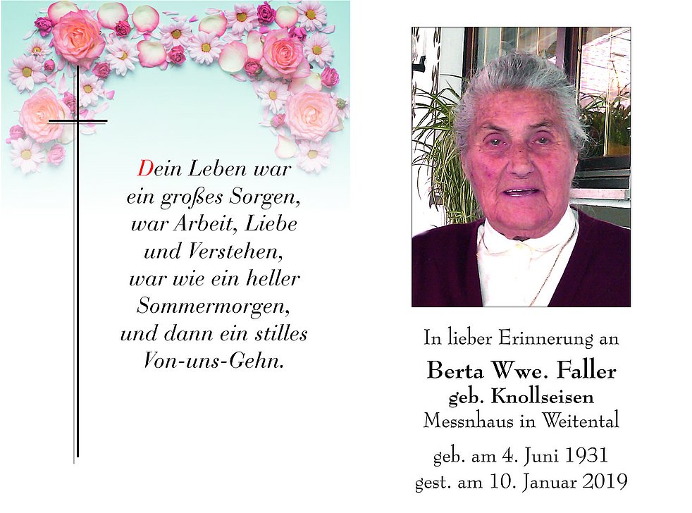 Begräbnisgottesdienst: 12.01. - 14:30 Uhr Weitental