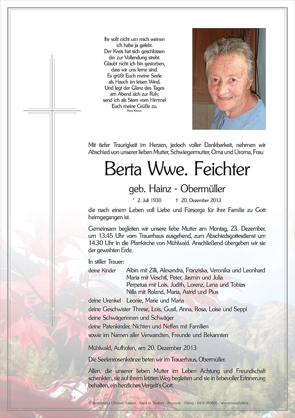 um 13.45 Uhr vom Trauerhaus ausgehend, zum Abschiedsgottesdienst um 14.30 Uhr in die Pfarrkirche von Mühlwald. Anschließend übergeben wir sie der geweihten Erde.