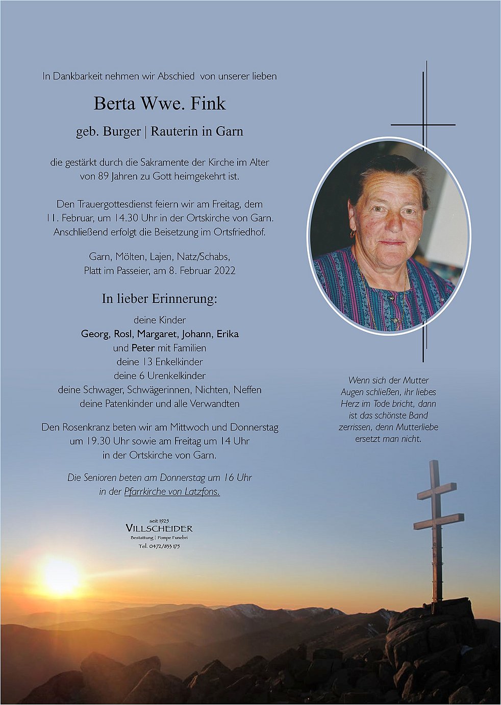 mit der Berta hon i als Nochborin und Tante so monch nettn Ratscher gimocht, dei mir in lieber Erinnerung bleibm. Pfiati Berta!