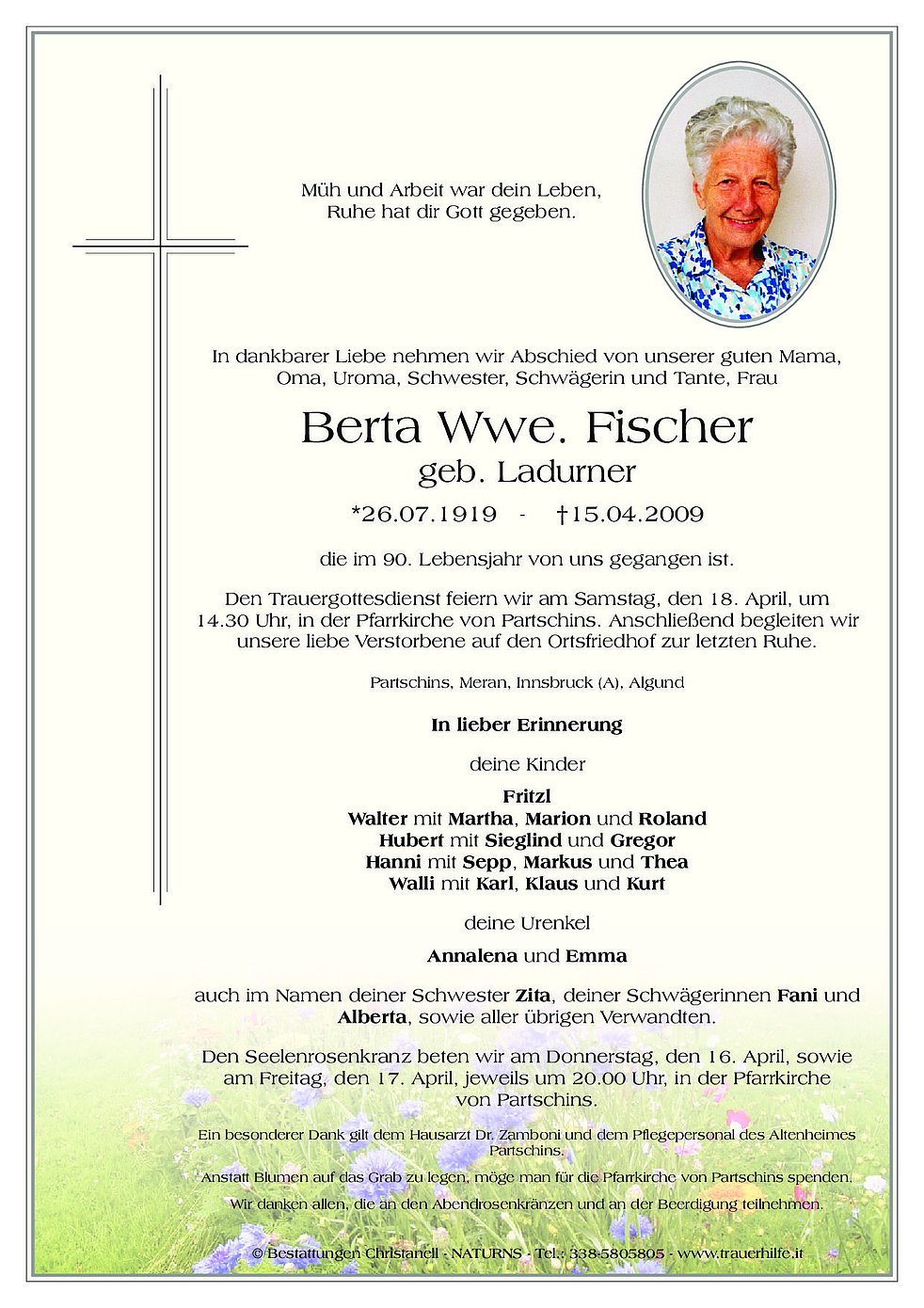 Den Trauergottesdienst feiern wir am Samstag, den 18. April, um 14.30 Uhr, in der Pfarrkirche von Partschins. Anschließend begleiten wir unsere liebe Verstorbene auf den Ortsfriedhof zur letzten Ruhe.