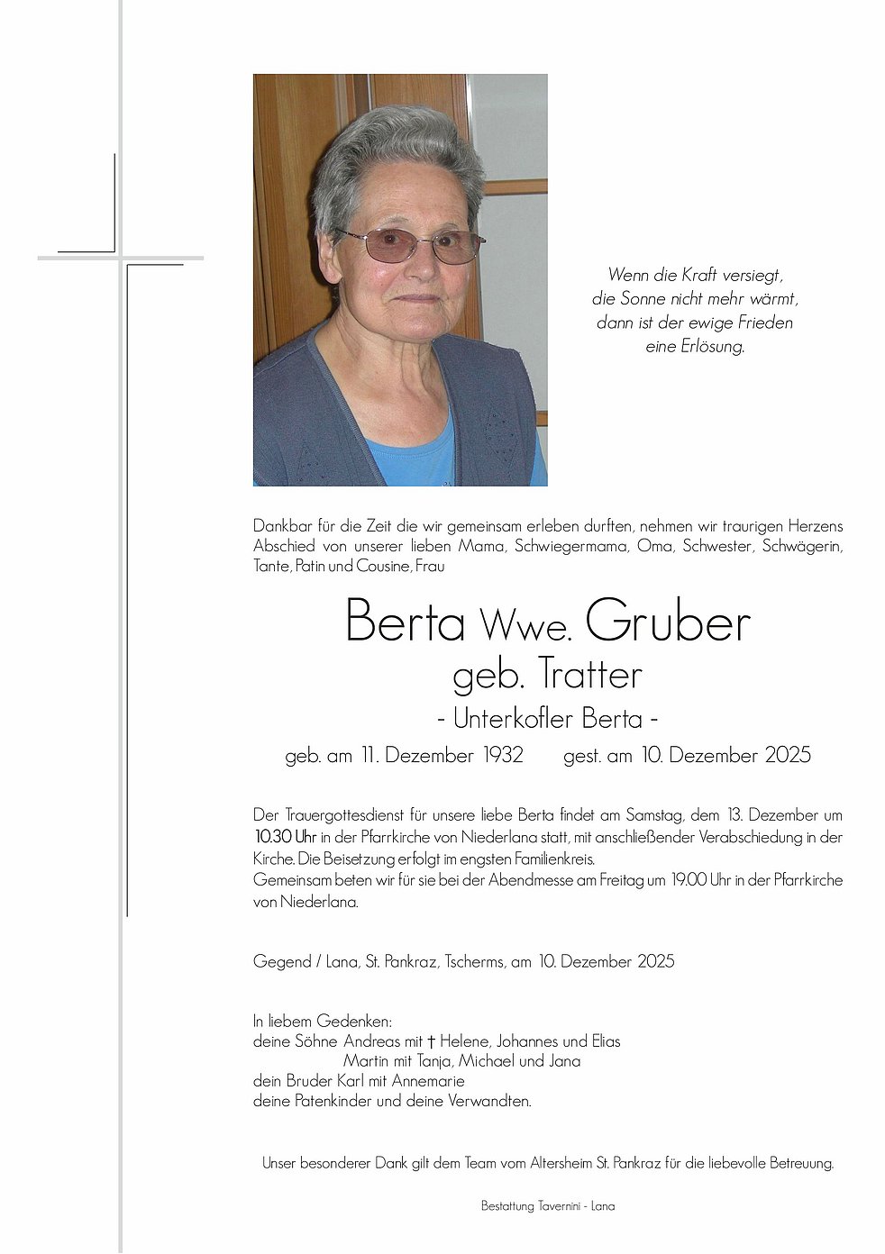 A Liachtl für di Tante Berta. Unser herzliches Beileid der Trauerfamilie.