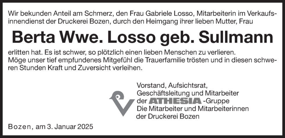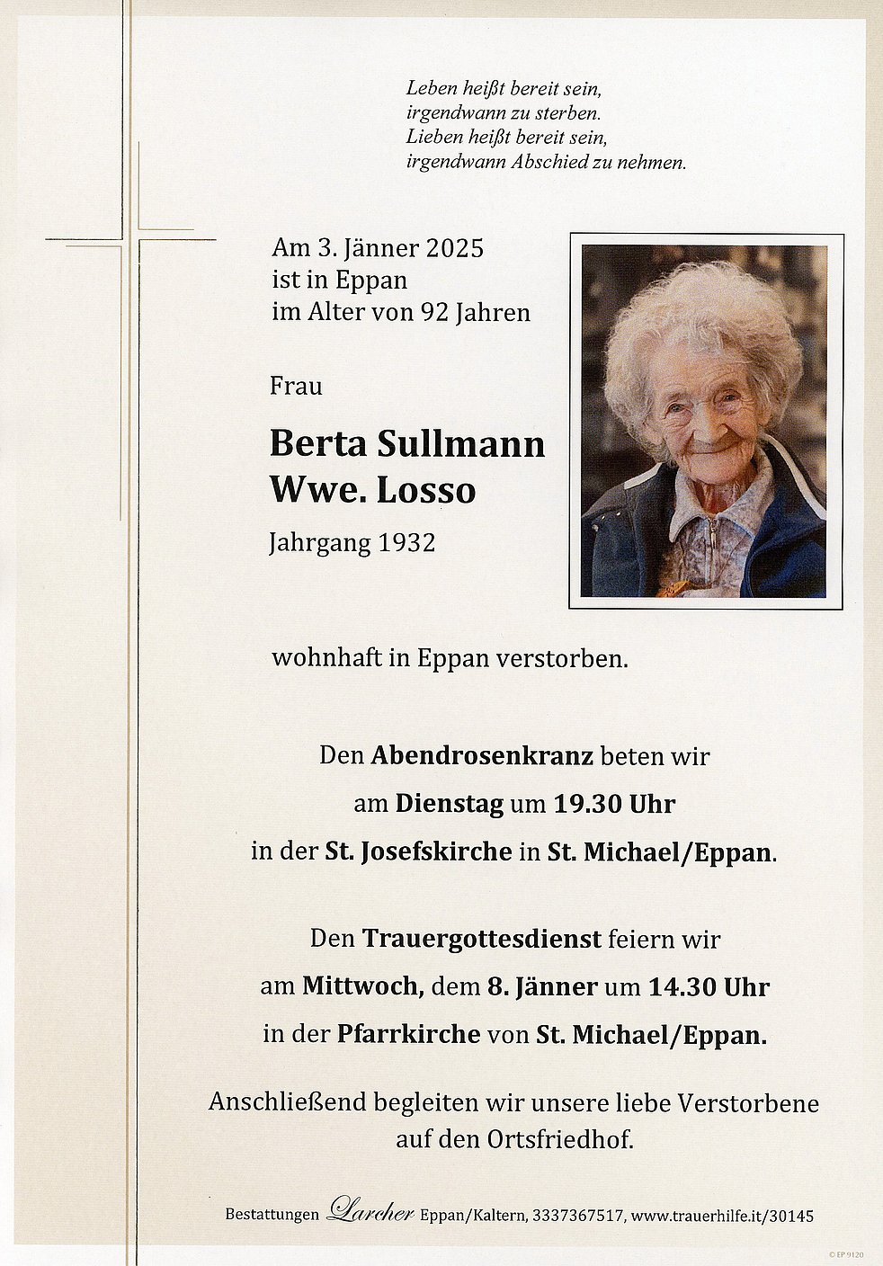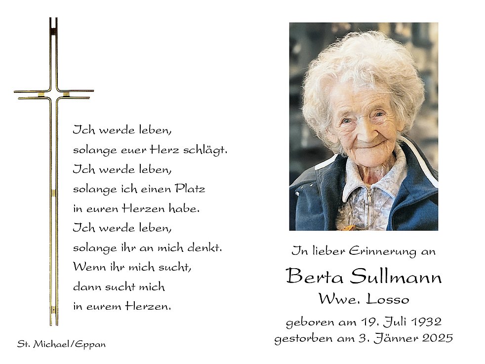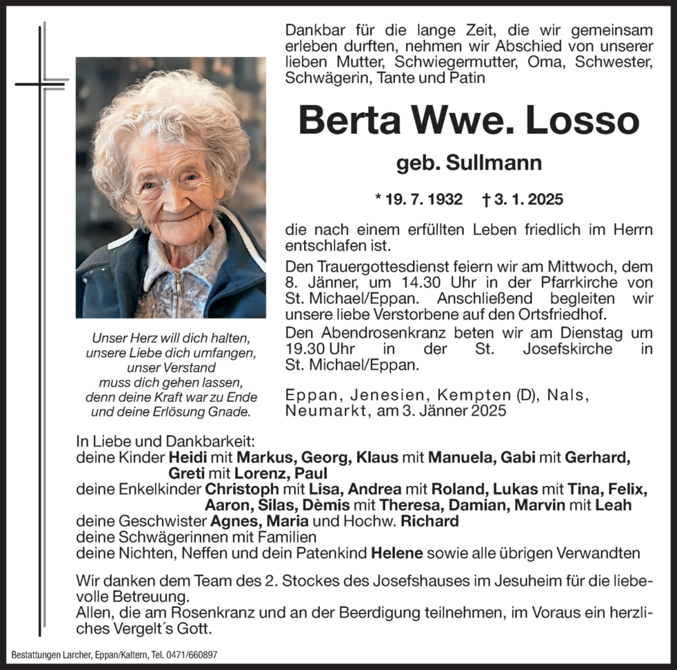 Den Trauergottesdienst feiern wir am Mittwoch, dem 8. Jänner um 14.30 Uhr in der Pfarrkirche von St. Michael/Eppan. Anschließend begleiten wir unsere liebe Verstorbene auf den Ortsfriedhof.