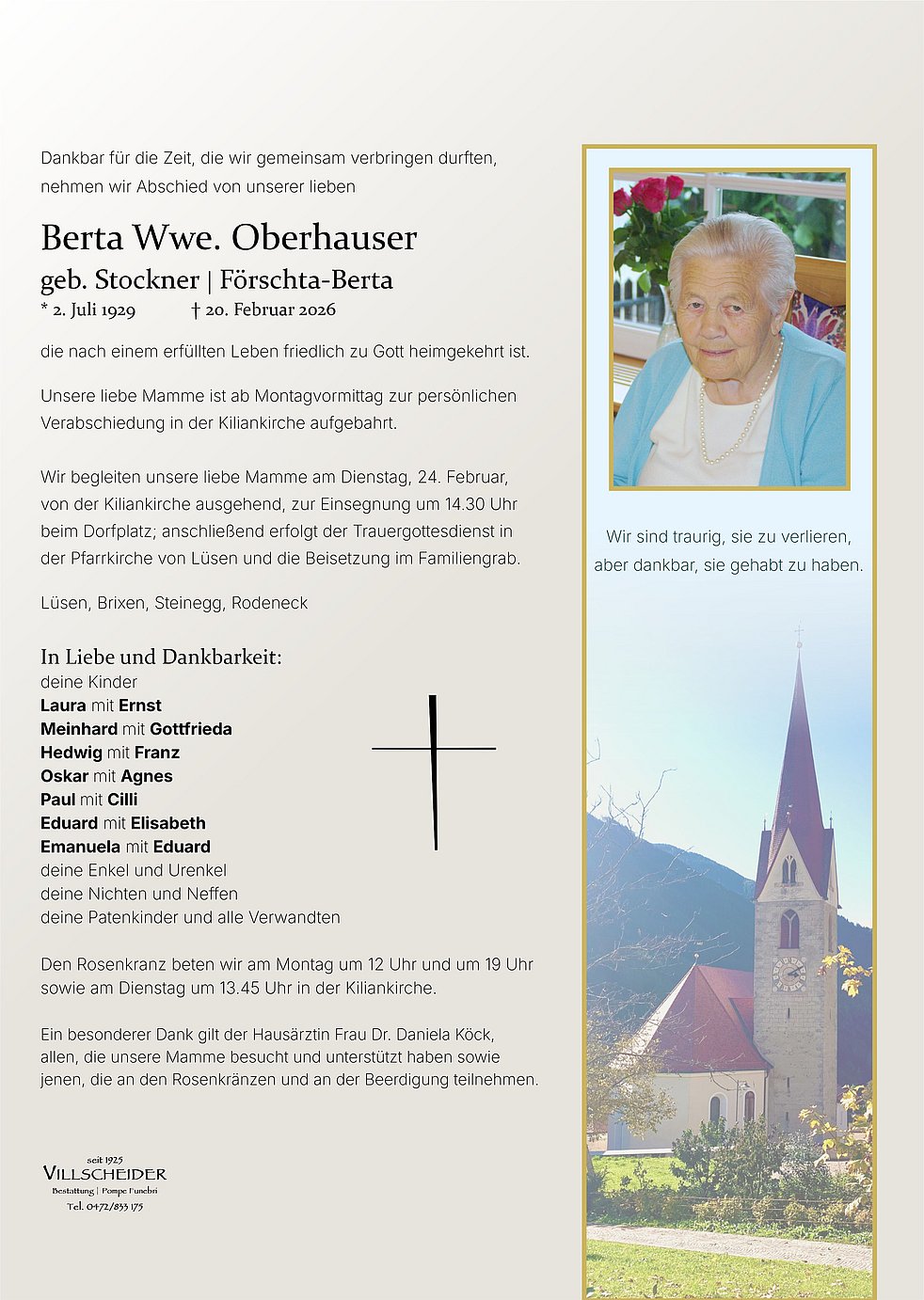 Liebe Berta, danke für deine Geschichten von Früher, deiner liebenswerten Art und deiner unbändigen Lust am Leben. Auch wenn die Gespräche über Gott und die Welt an der Bank vor deinem Haus langsam verstummen..so bleibst du in unseren Herzen.