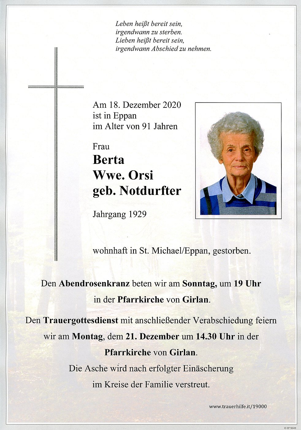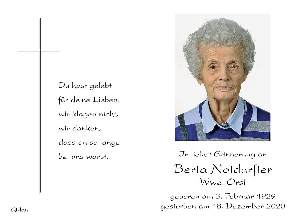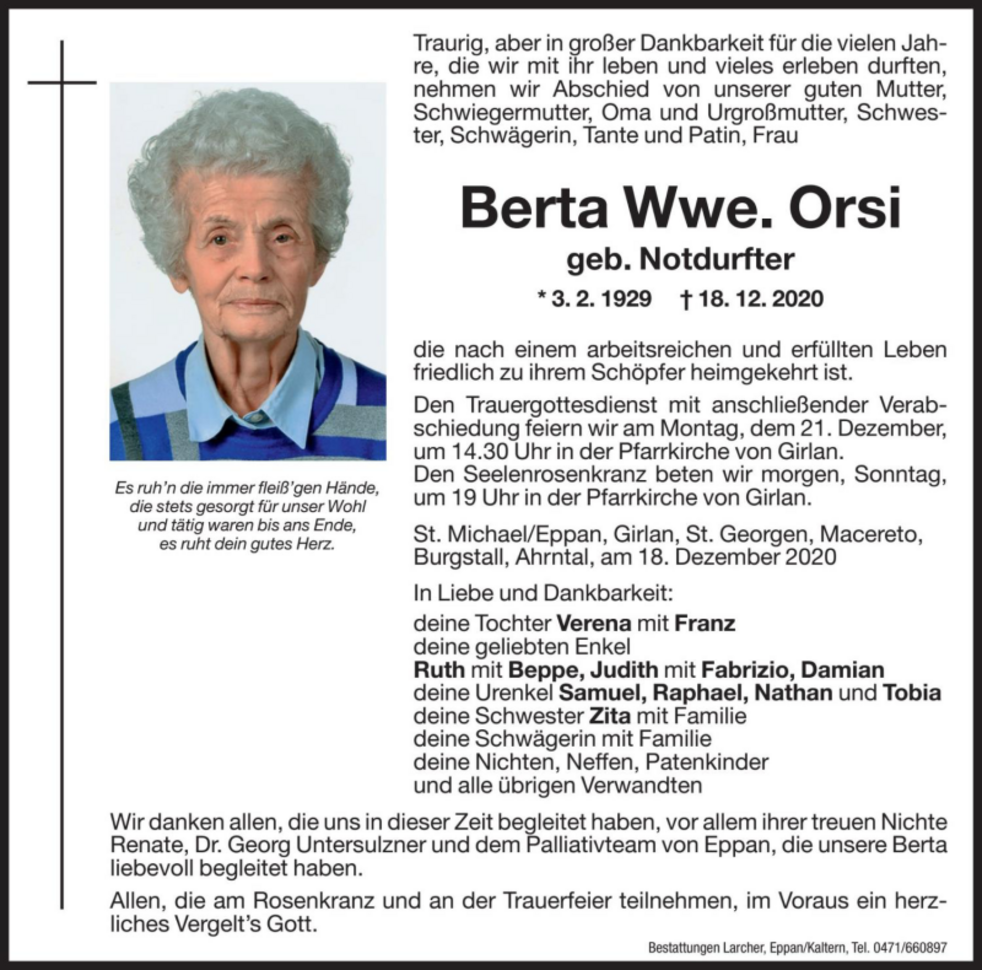 Wir danken allen, die uns in dieser Zeit begleitet haben, vor allem deiner treuen Nichte Renate, Dr. Georg Untersulzner und dem Palliativteam Eppan, die unsere Berta liebevoll begleitet haben.