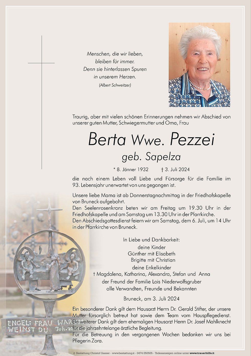 Ein besonderer Dank gilt dem Hausarzt Herrn Dr. Gerald Stifter, der unsere Mutter fürsorglich betreut hat sowie dem Team vom Hauspflegedienst.