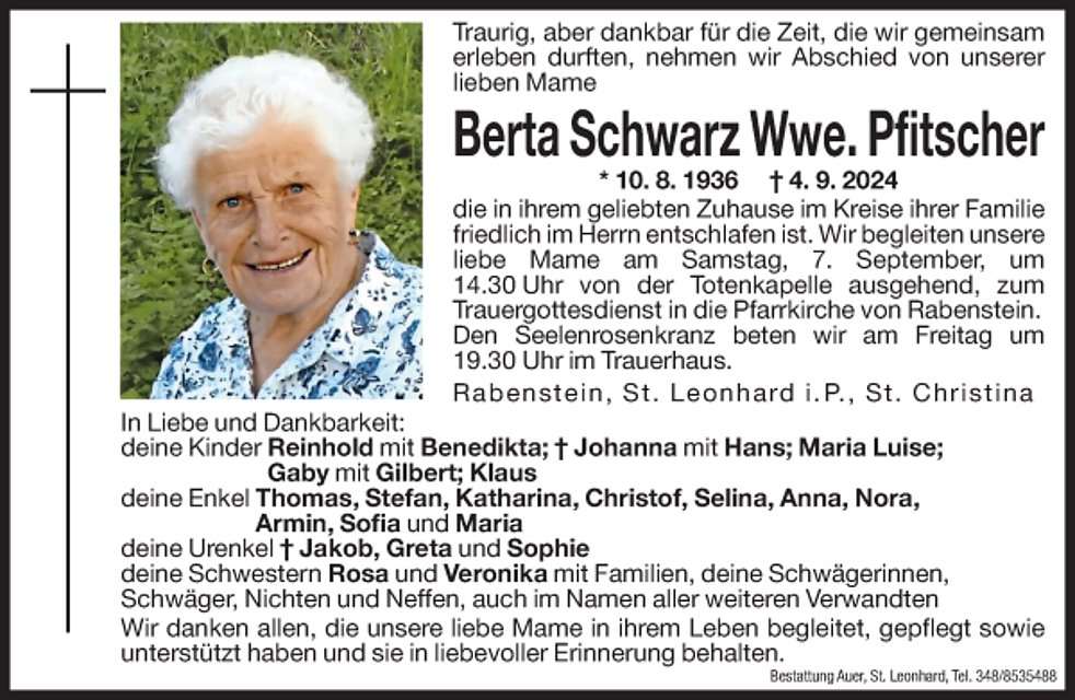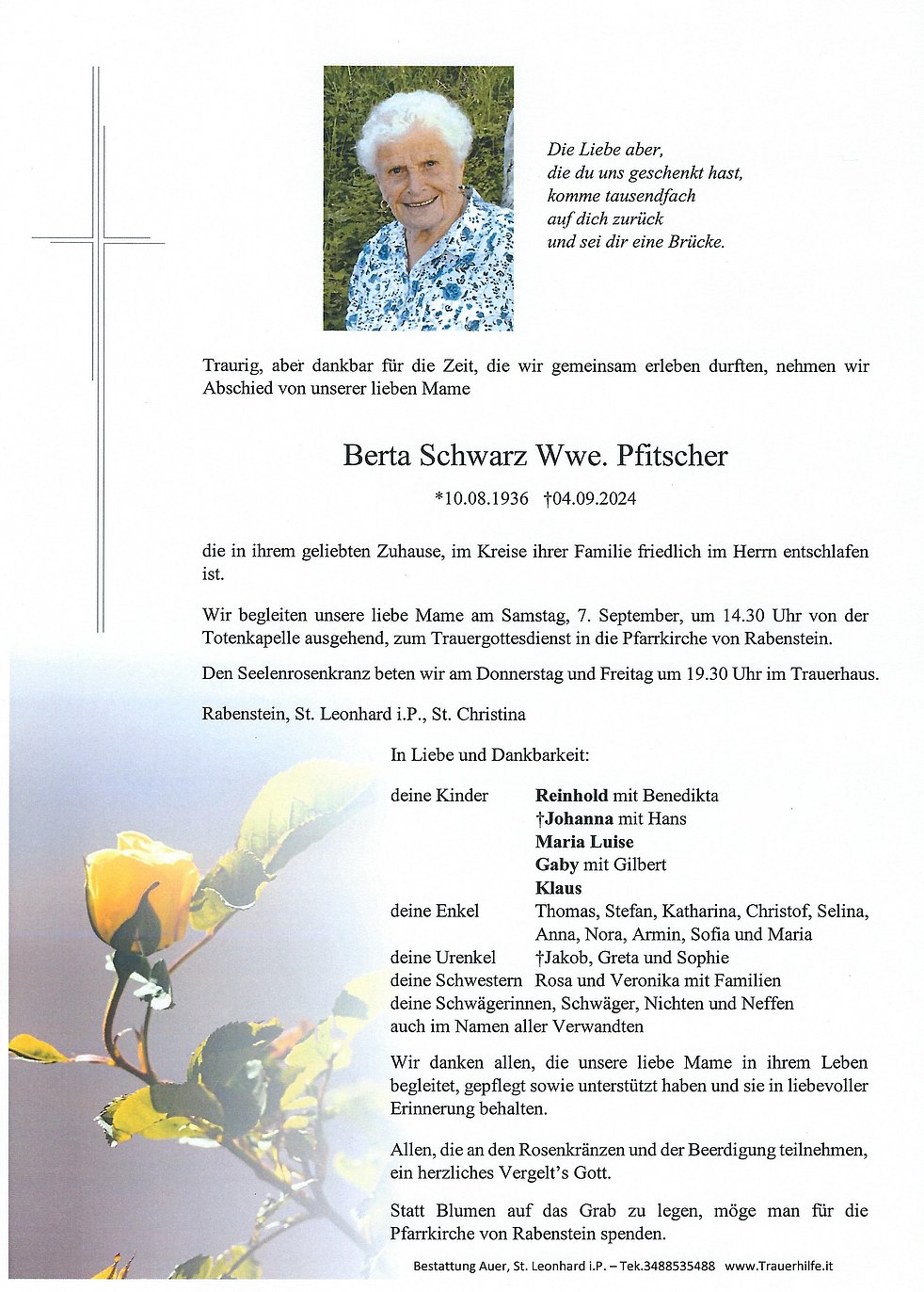 Wir begleiten unsere liebe Mame am Samstag, 7. September, um 14.30 Uhr von der Totenkapelle ausgehend, zum Trauergottesdienst in die Pfarrkirche von Rabenstein.