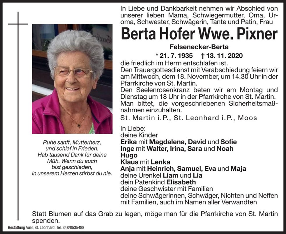 Den Trauergottesdienst mit Verabschiedung feiern wir am Mittwoch, dem 18. November, um 14.30 Uhr in der Pfarrkirche von St. Martin.