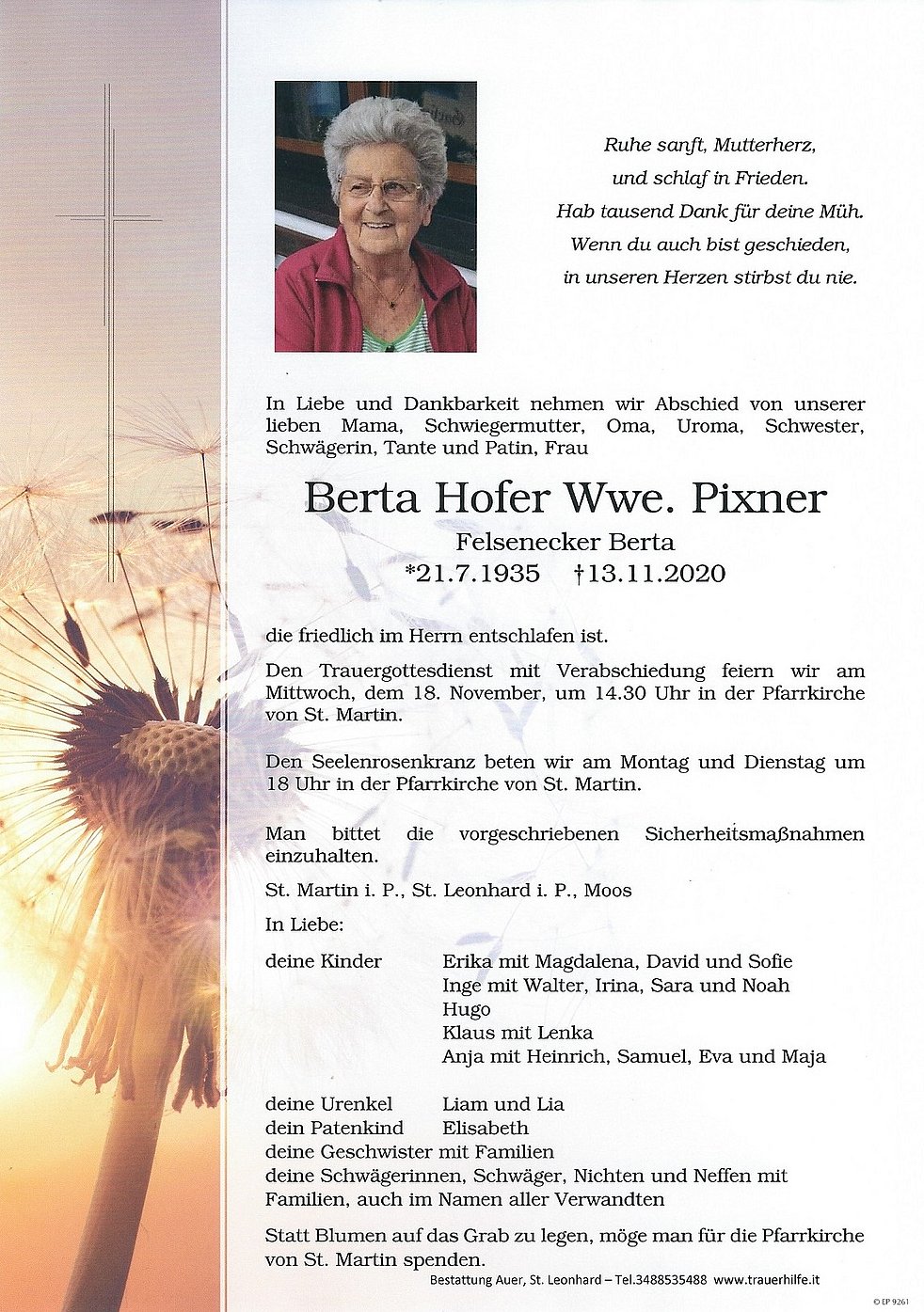 In Liebe und Dankbarkeit nehmen wir Abschied von unserer lieben Mama, Schwiegermutter, Oma, Uroma, Schwester, Schwägerin, Tante und Patin, Frau