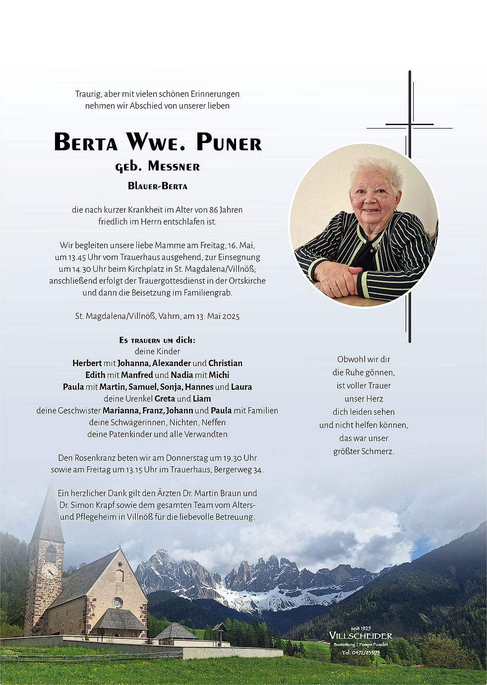 Trauerfeier: 16.05. - 14:30 Uhr St. Magdalena/Villnöß
