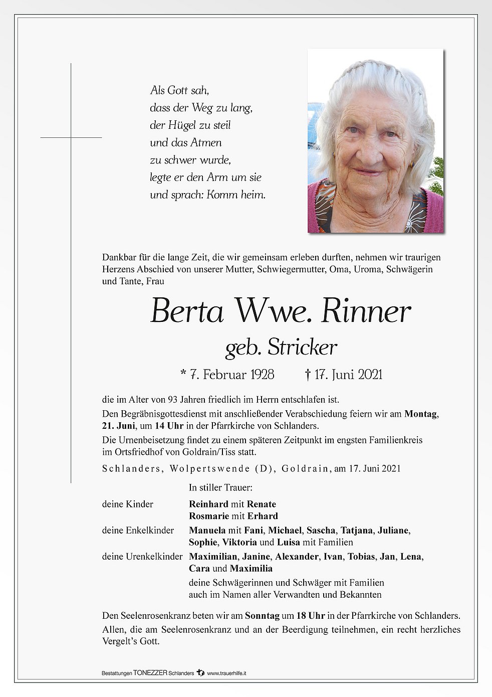 Den Begräbnisgottesdienst mit anschließender Verabschiedung feiern wir am Montag, 21. Juni, um 14 Uhr in der Pfarrkirche von Schlanders.
